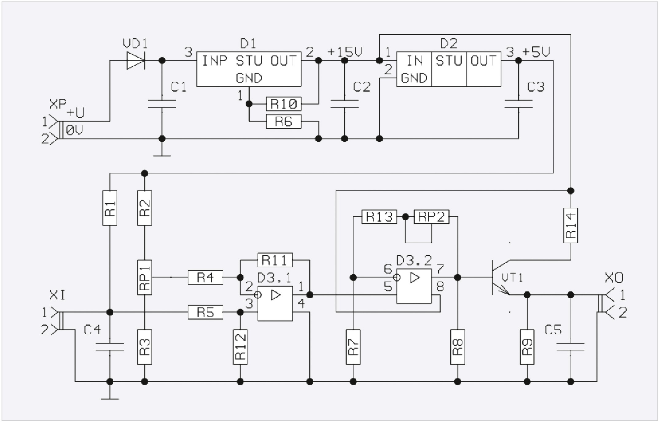 Питание преобразователя осуществляется от внешнего источника питания с напряжением 24 В, подключённого к разъёму XP. Для защиты от переполюсовки при подключении источника питания в преобразователе установлен защитный диод VD1. Напряжение питания 24 В преобразуется стабилизатором D1 с резисторами R10 и R6 в питающее напряжение 15 В для операционных усилителей и выходного каскада преобразователя. Второй преобразователь напряжения на основе микросхемы D2 преобразует напряжение 15 В в стабильное напряжение питания 5 В для измерительного моста. Конденсаторы C1…C3 обеспечивают фильтрацию питающих напряжений.