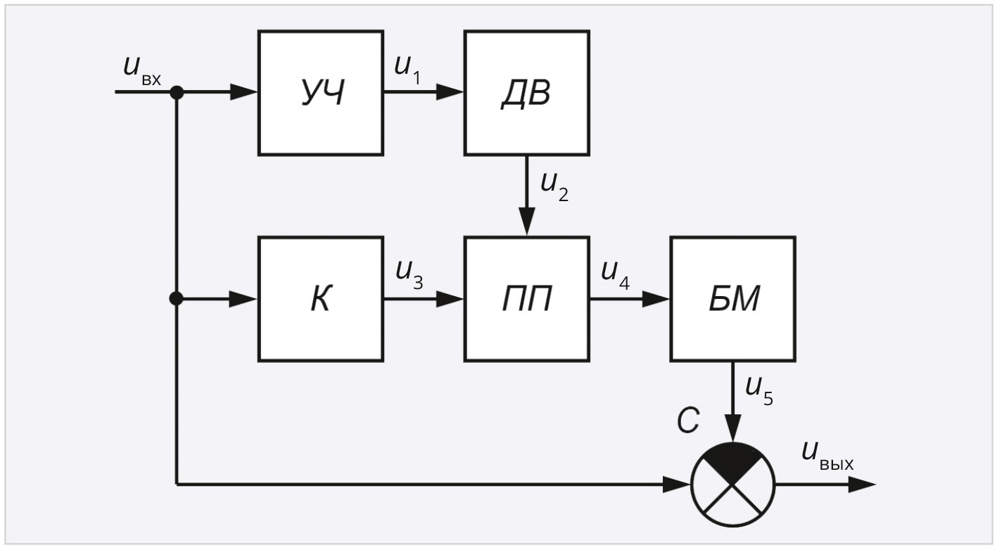 В блоке масштабирования БМ напряжение u4 масштабируется по амплитуде, и на его выходе формируется напряжение u5, которое подаётся на второй вход сумматора С (рис. 1). Коэффициент передачи блока масштабирования БМ выбран Кп = 0,18.