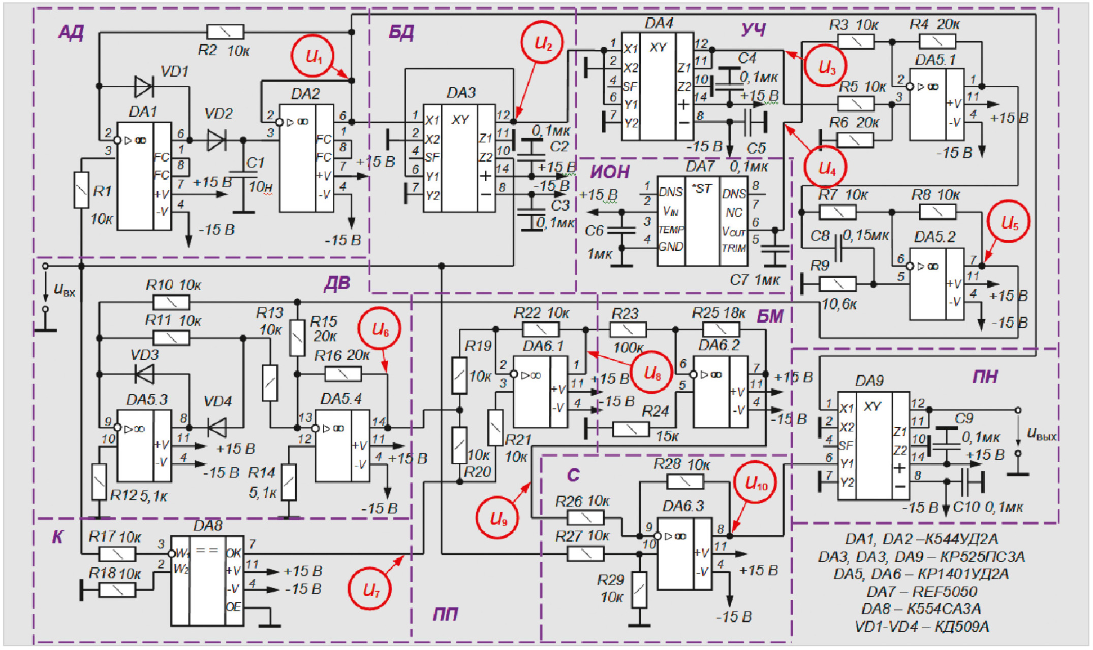 Рассмотрим работу принципиальной схемы (рис. 2) формирователя. Входное синусоидальное напряжение uвх = Um вх sinωt подаётся на входы амплитудного детектора АД, блока деления БД и компаратора К (рис. 2). В блоке деления БД входное напряжение uвх делится на его амплитуду Um вх, в результате чего на выходе блока деления БД формируется напряжение u2 = 10 sinωt с амплитудой напряжения 10 В, независимой от амплитуды входного напряжения Um вх (в структурной схеме амплитуда напряжения u2 имеет единичное значение) [7]: