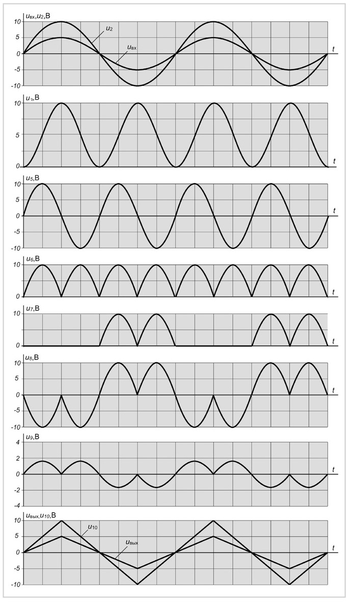 Выходное напряжение u8 переключателя полярности ПП подаётся на вход блока масштабирования БМ на ОУ DA6.2, где инвертируется и уменьшается до u9 = 1,8 В. Это напряжение u9 вычитается в параллельном сумматоре С на ОУ DA6.3 из входного напряжения uвх с выхода удвоителя частоты УЧ. В результате на выходе сумматора С формируется напряжение u10 треугольной формы амплитудой, равной 10 В (рис. 3), которое подаётся на вход y1 перемножителя напряжений ПН на DA9. На вход x1 подаётся напряжение u1 с выхода амплитудного детектора АД (рис. 2).