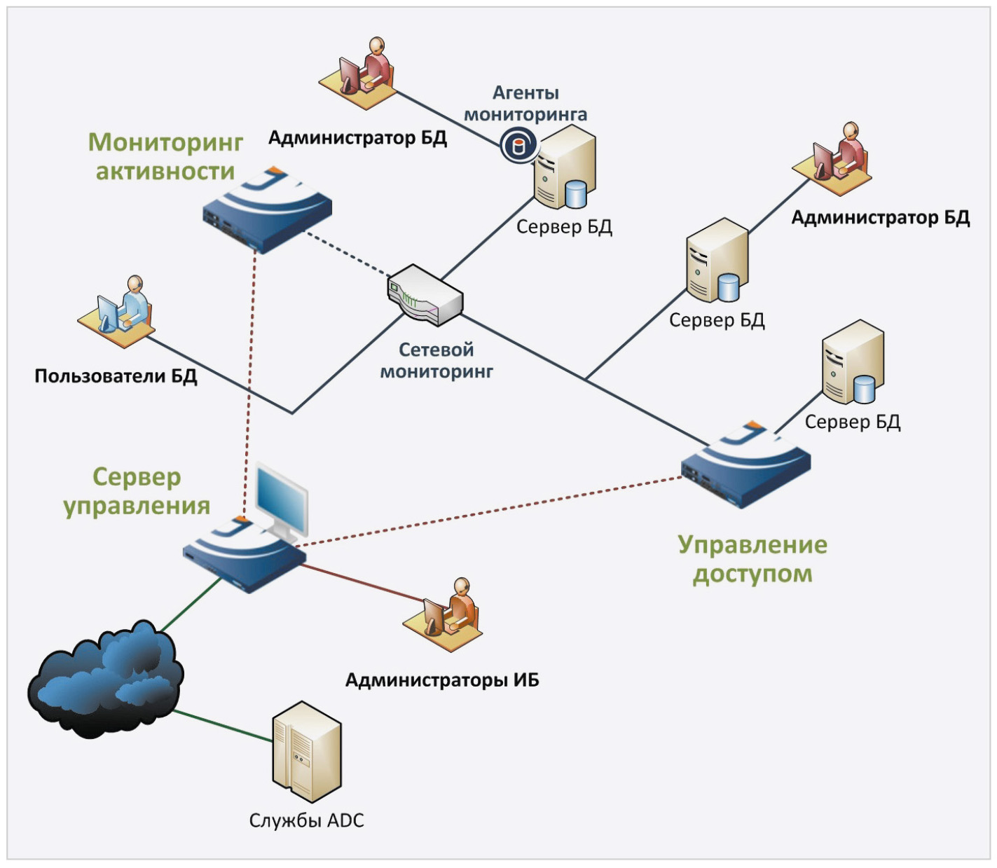 Подсистема управления доступом представляет собой межсетевой экран, позволяющий осуществлять управление доступом к БД посредством анализа SQL-запросов пользователей. Подсистема мониторинга – модуль, обрабатывающий данные об активности пользователей, поступающих с активного сетевого оборудования, а также (при наличии такой возможности) от агентов, развёрнутых непосредственно на серверах. Агенты мониторинга – программные модули, разворачиваемые на серверах. Подсистема блокирования доступа обеспечивает перехват, анализ и соответствующее реагирование (и блокирование) SQL-запросов пользователей. Сервер управления основан на Application Defense Center (ADC), обеспечивающем доступ к актуальным обновлениям конфигурационных данных, включая сигнатуры атак и др.