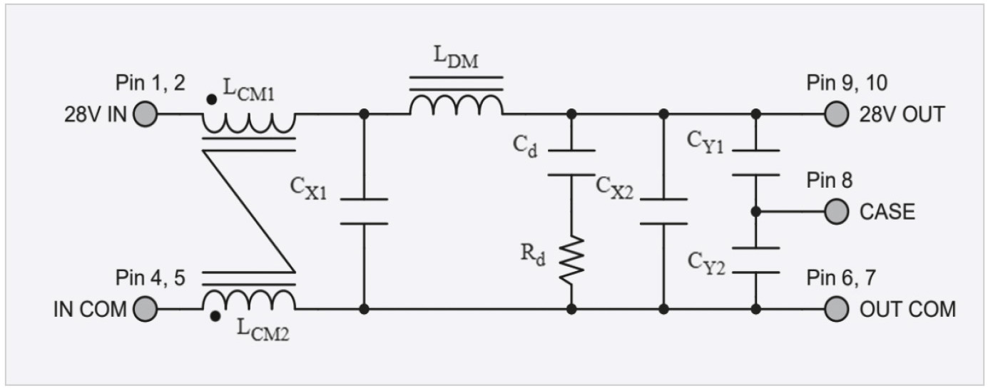 Все фильтры имеют одинаковую схему и отличаются только номиналами элементов, габаритами, весом и расположением выводов. Схема фильтра ЭМП из ряда VSCF приведена на рис. 3.