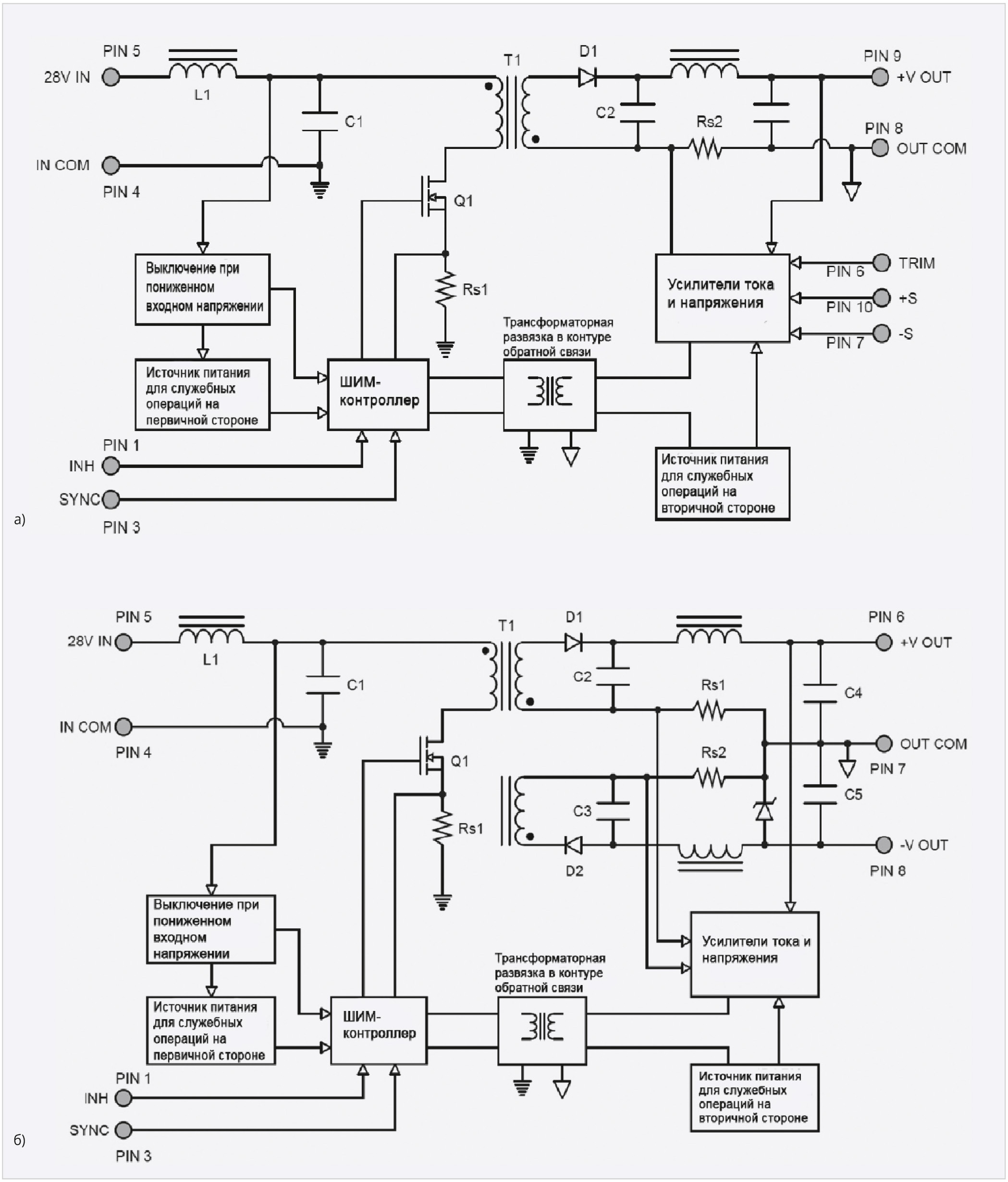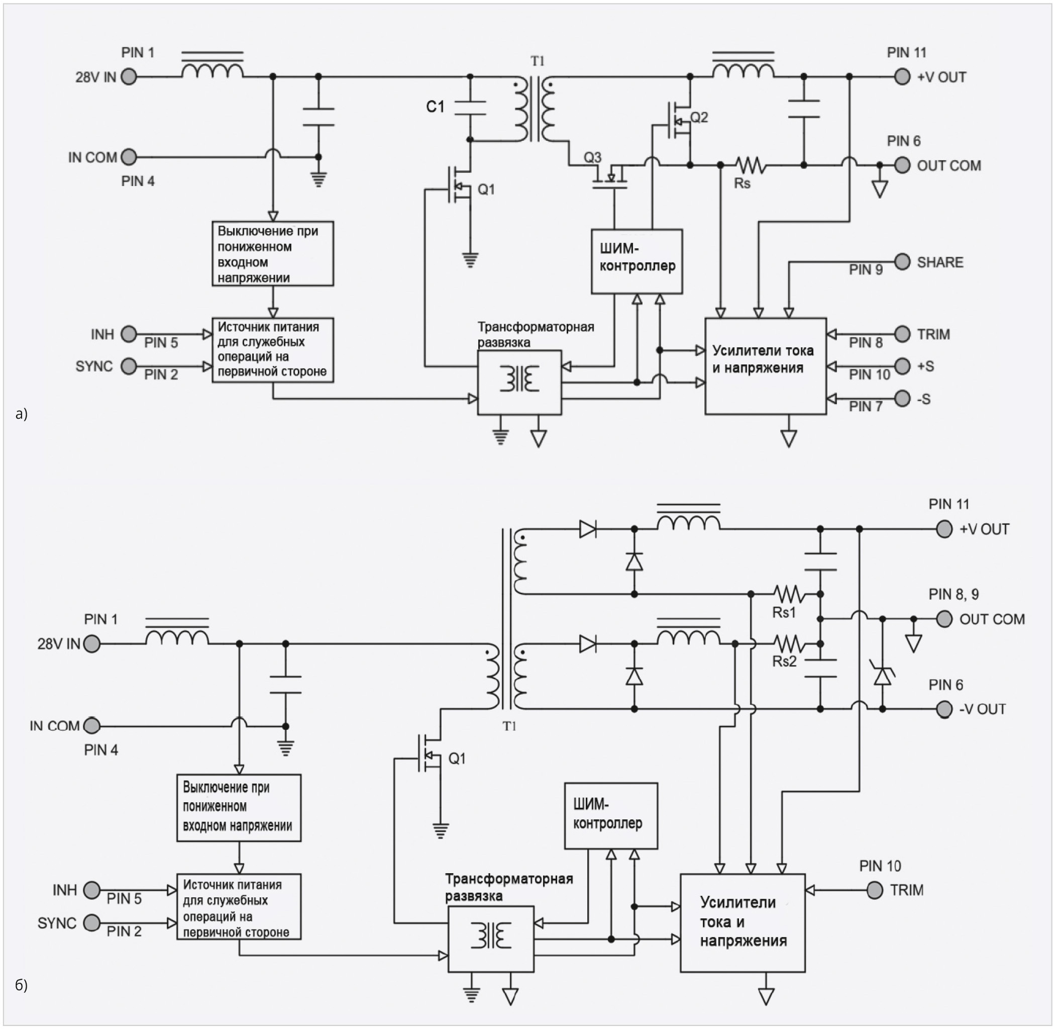 Для исключения из схемы критичного к воздействию радиации элемента – транзистора MOSFET, который при выходе из строя создаёт короткозамкнутый путь от источника входного напряжения с низким импедансом на землю, применяется структура прямоходового преобразователя с одним силовым ключом и резонансным размагничиванием сердечника трансформатора. Структурная схема одноканального преобразователя напряжения VSC100-2800S показана на рис. 9а, двухканальной модели – на рис. 9б.