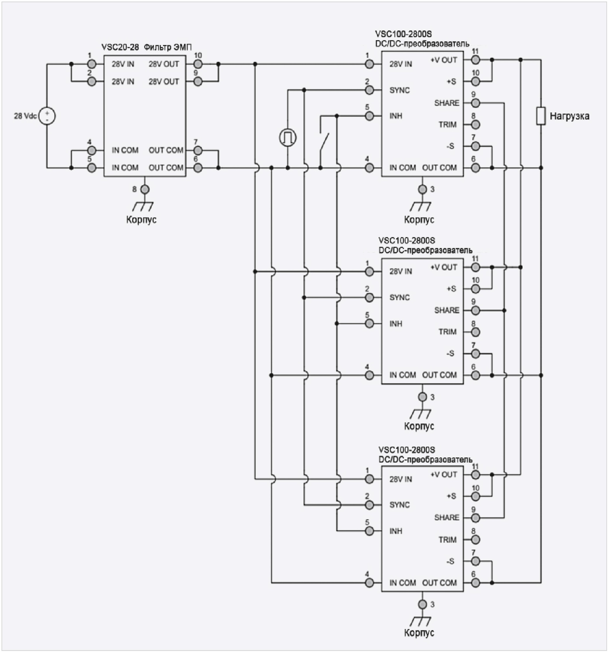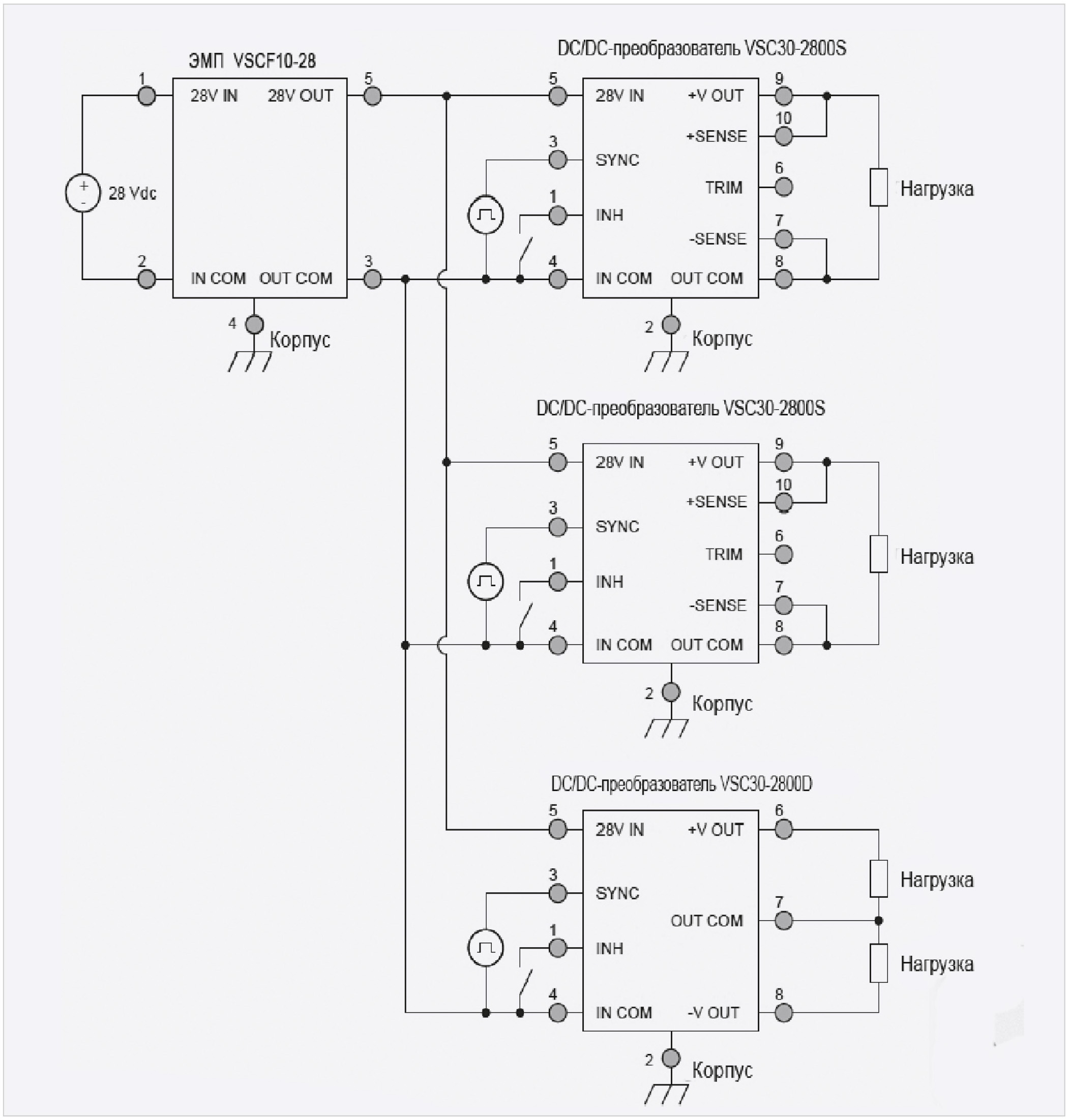Схема включения трёх модулей VCS30, работающих на разные нагрузки с использованием выводов обратной связи и одним фильтром VSC10-28 на входе показана на рис. 6.