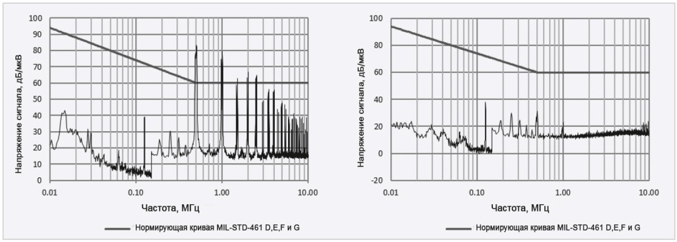 Для обеспечения соответствия требованиям стандарта MIL-STD-461 к уровню излучаемых кондуктивных помех на входе преобразователей предлагаются радиационно-устойчивые пассивные фильтры электромагнитных помех VSCF10-28 и VSCF20-28 с проходными токами 10 и 20 A, обеспечивающие ослабление помех с коэффициентом 55 дБ на частоте 500 кГц.