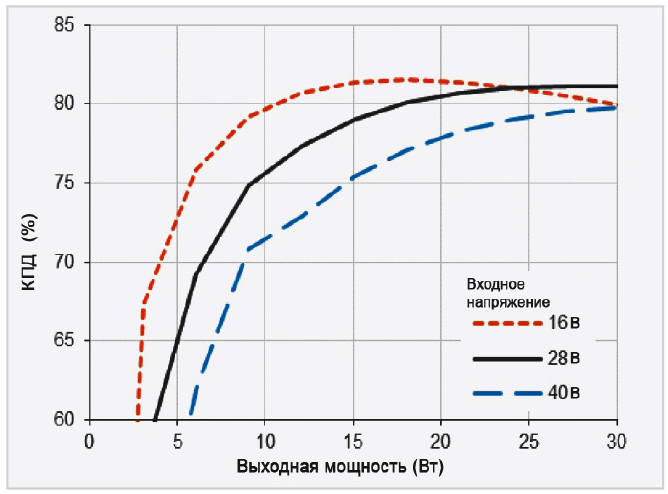 Небольшое уменьшение КПД для режима с входным напряжением 16 В при максимальной выходной мощности объясняется ростом потерь в элементах модуля при подходе к их предельным энергетическим возможностям. Типовая зависимость КПД от выходной мощности позволяет выбрать оптимальный режим работы модуля в соответствии с условиями применения.