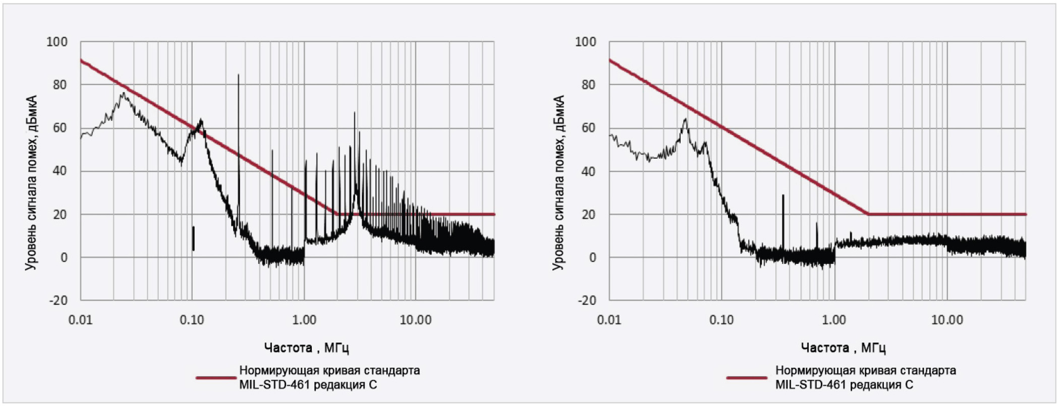 При использовании фильтра на входе преобразователя уровни помех значительно ниже нормирующей кривой во всём диапазоне частот от 10 кГц до 10 МГц.