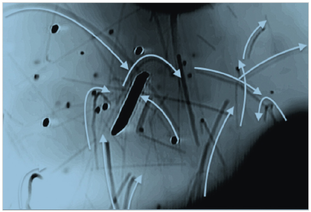 Многие объекты демонстрируют изменение траектории на 45, 90 и 180 градусов, изменяют свою скорость, останавливаются, зависают, ускоряются, совершают внезапные или медленные повороты вокруг электрифицированного троса. Длина траектории полёта, определённая с помощью RegiStax, прямо пропорциональна скорости объекта. Чем быстрее движется структура, зафиксированная на видеозаписи STS-75, тем длиннее линия, обозначающая её траекторию (рис. 5 и 6). Отдельные плазменные образования движутся с существенно разными скоростями, направлениями и траекториями, некоторые совершают повороты и изменения направления от 45 до 180 градусов, что указывается кривизной и длиной построенной траектории полета, которая также является мерой скорости.