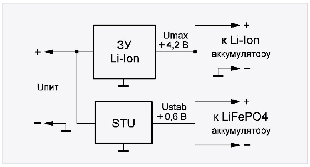 ЗУ Li-Ion дополнено блоком STU – стабилизатором напряжения, поддерживающим на своём выходе стабильное напряжение +0,6 вольта. Очевидно, что на конечном этапе заряда (CV) напряжение на аккумуляторе LiFePO4, подключённом согласно блок-схеме, будет точно равно требуемому 3,6 вольта. Встречаются случаи, когда в роли блока STU советуют применить мощный кремниевый диод, включённый в прямом направлении, или транзистор, у которого вывод базы соединён с выводом коллектора. Конечно, при таком решении ни о какой стабильности (в том числе температурной) выходного напряжения 3,6 вольта на конечном этапе заряда говорить не приходится. Её способен обеспечить только стабилизатор, например, компенсационный параллельного типа. В зависимости от требуемого начального тока заряда на этапе СС (Constant Current – постоянный ток) ЗУ и стабилизатор STU должны этот ток обеспечивать и выдерживать.