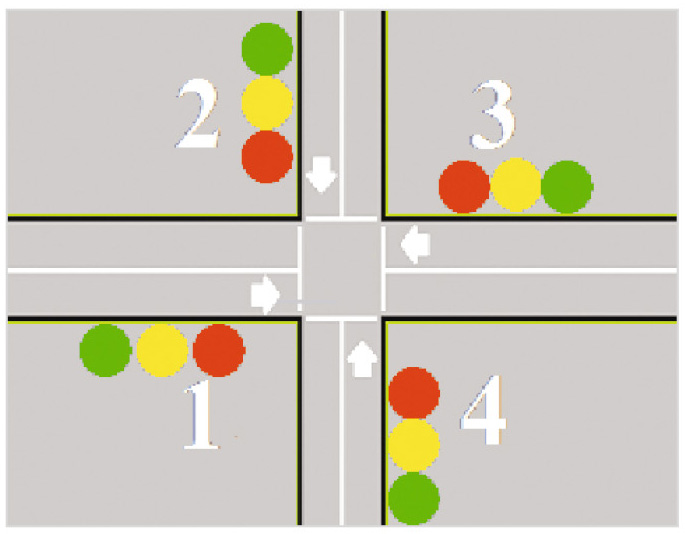 Управление светофорами производится попарно. Светофоры 1 и 3 устанавливаются для обоих направлений движения по первой дороге перекрёстка, а светофоры 2 и 4 аналогично для второй дороги перекрёстка, пересекающей первую, как показано на рис. 2.
