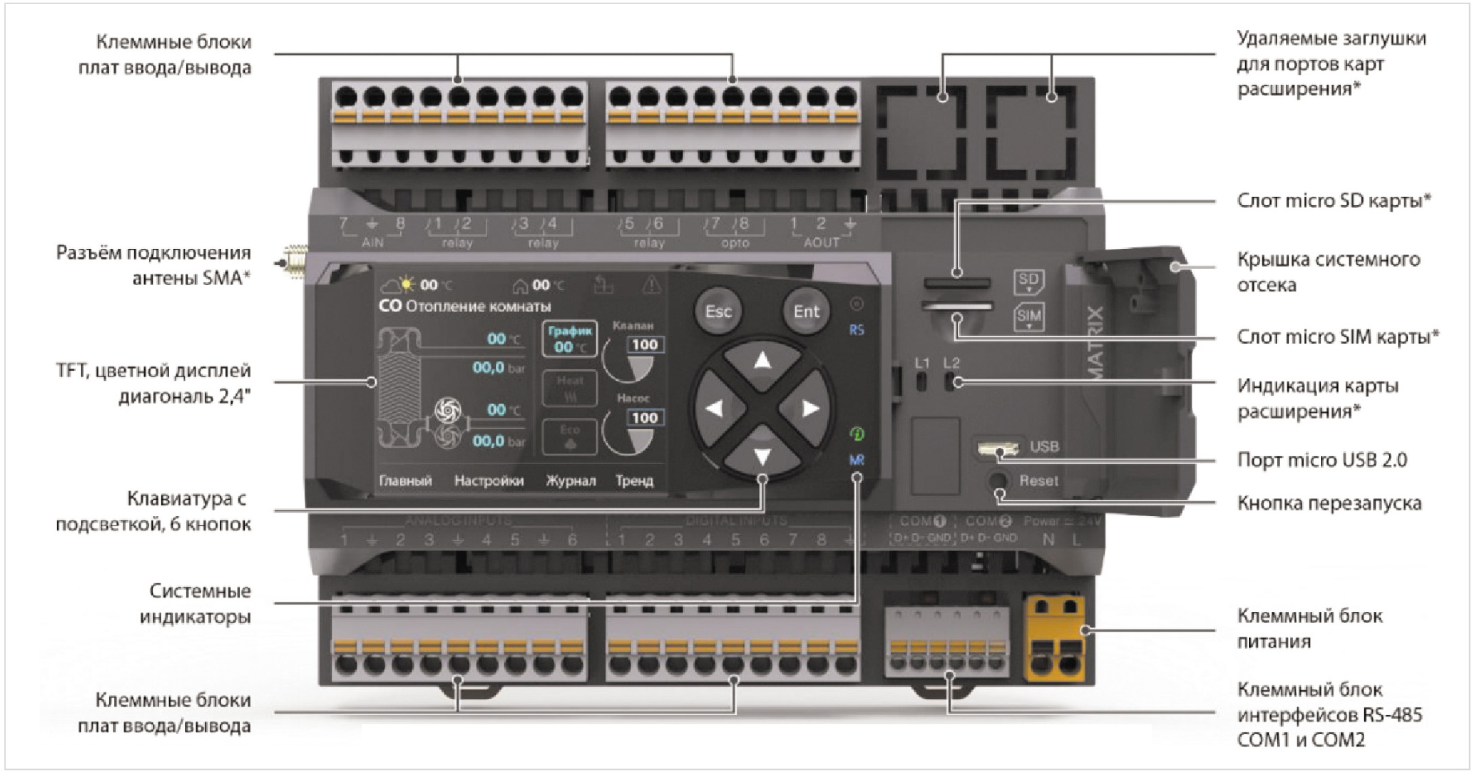 Для автоматики управления светофорами был выбран программируемый логический контроллер Matrix-1021-70-4 отечественной компании Segnetics [1]. Внешний вид контроллера Matrix представлен на рис. 3.