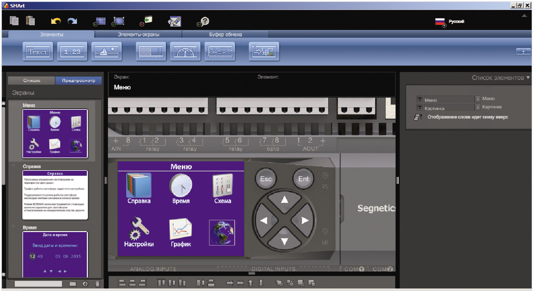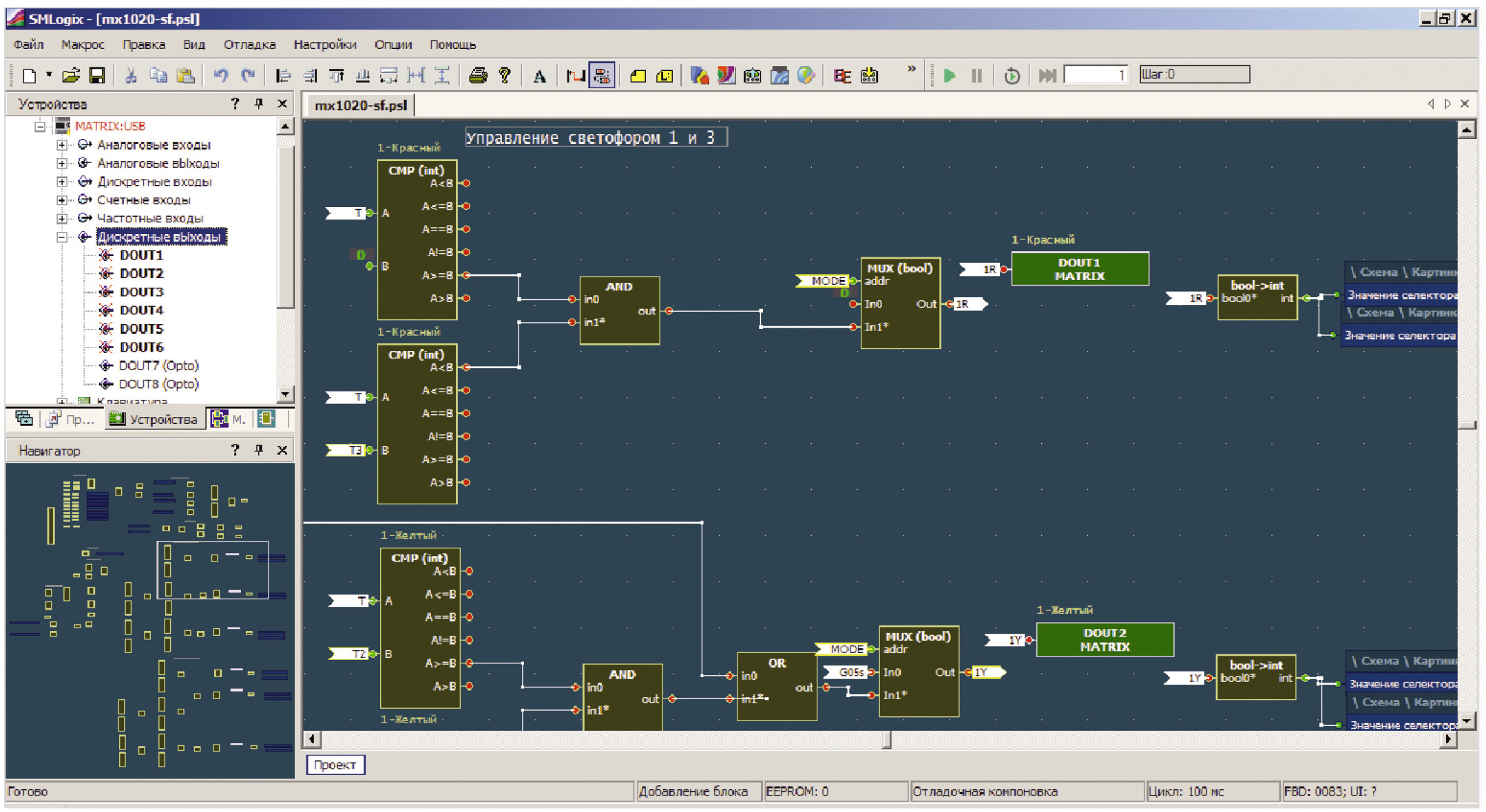 Программа управления светофорами написана на языке функциональных блоков в свободной среде разработки SMLogix [2]. Достаточно подробное описание этой среды разработки и работы с ней приведено в источнике [3]. Внешний вид главного окна программы представлен на рис. 5.