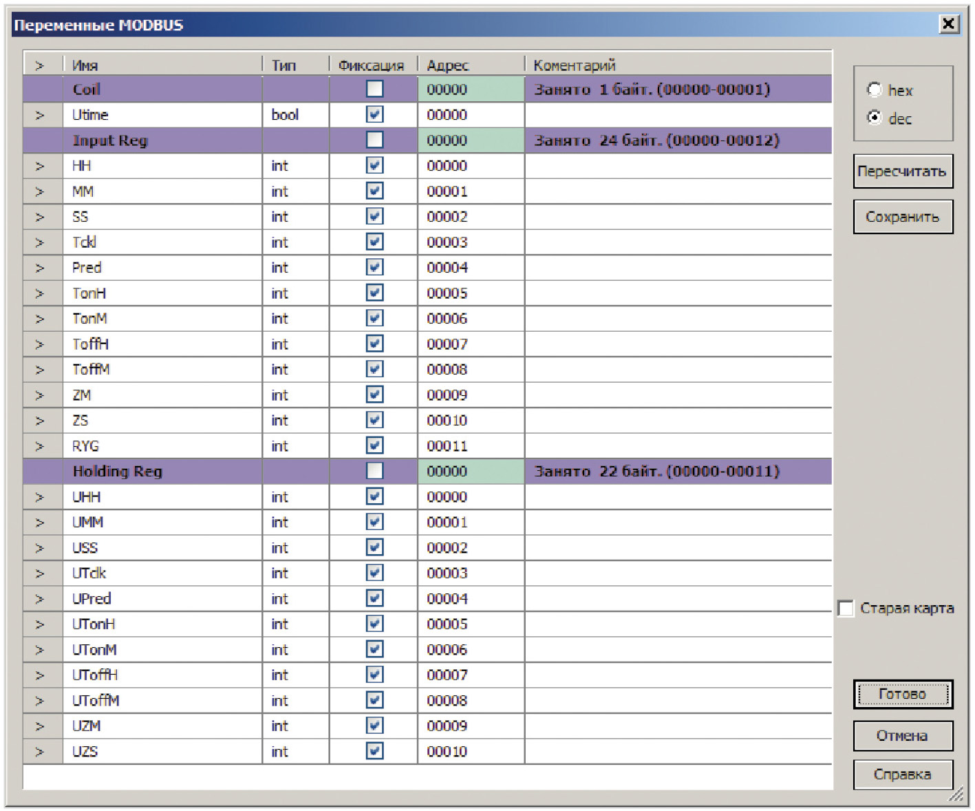 Контроллер позволяет обеспечить диспетчеризацию светофоров с помощью встроенных в него интерфейсов. В проект добавлены регистры с картой памяти, приведённой на рис. 7.