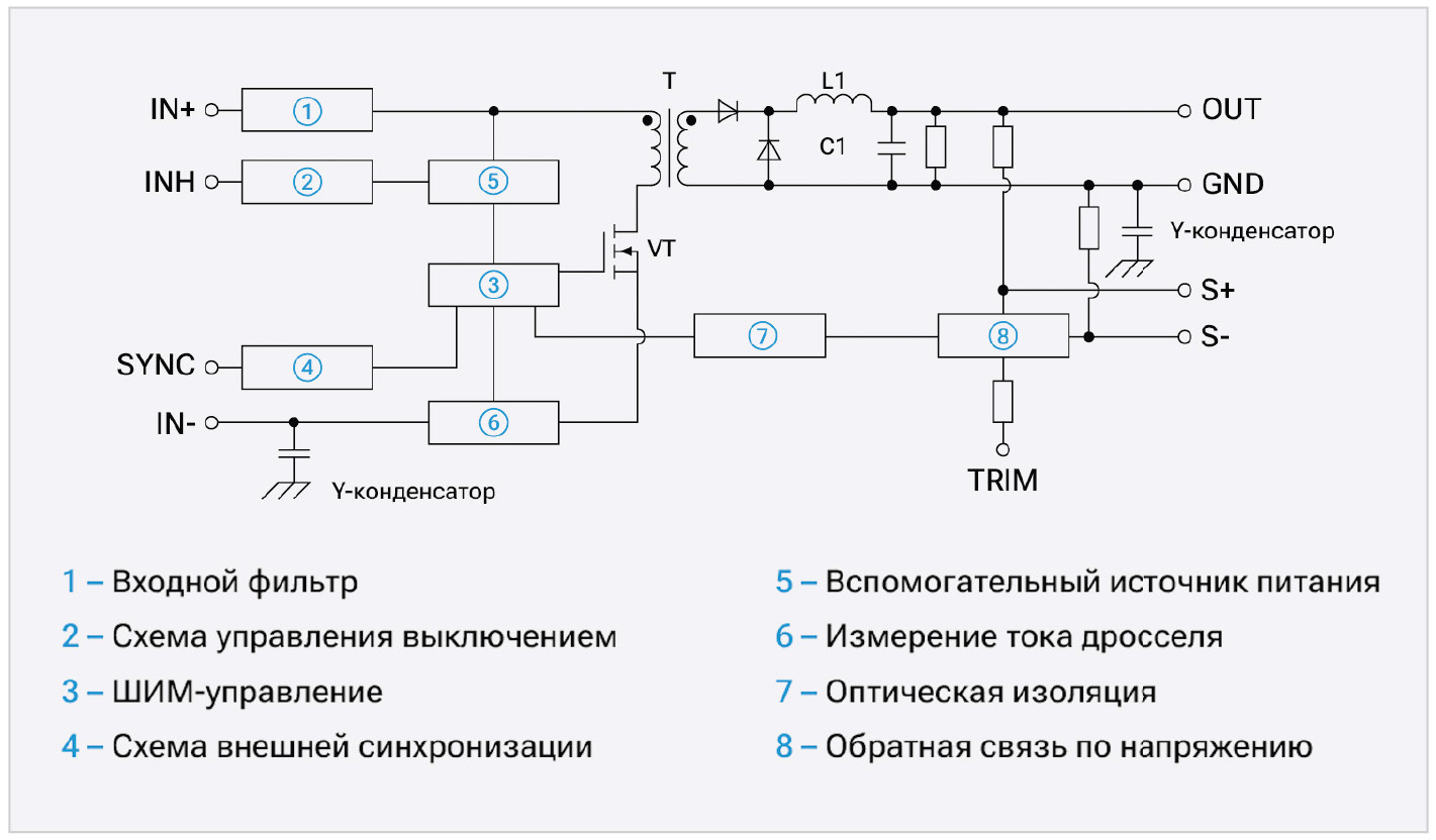 Функциональная блок-схема одноканального преобразователя SWH120-28S05MMb показана на рис. 1.