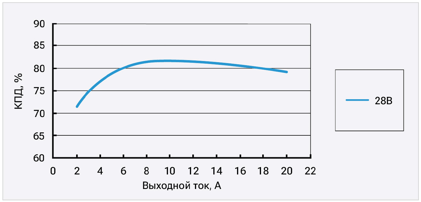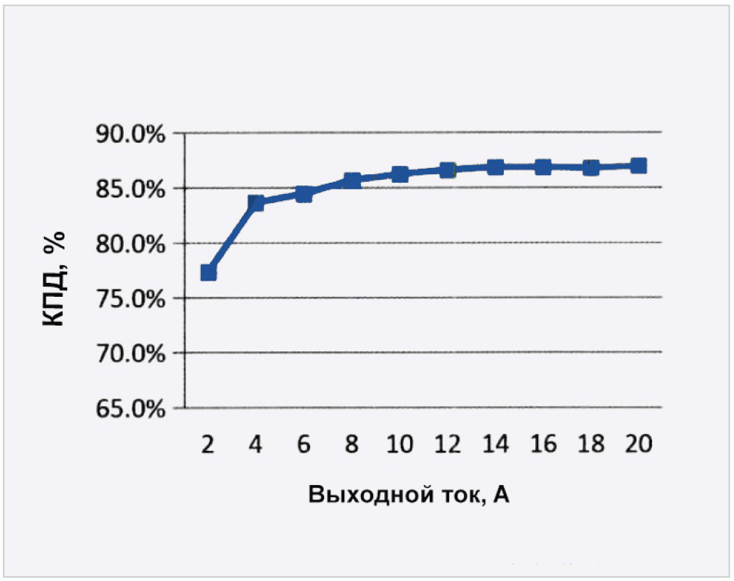 Зависимость КПД от тока нагрузки для одноканальной модели с выходным напряжением 5 В показана на рис. 2.