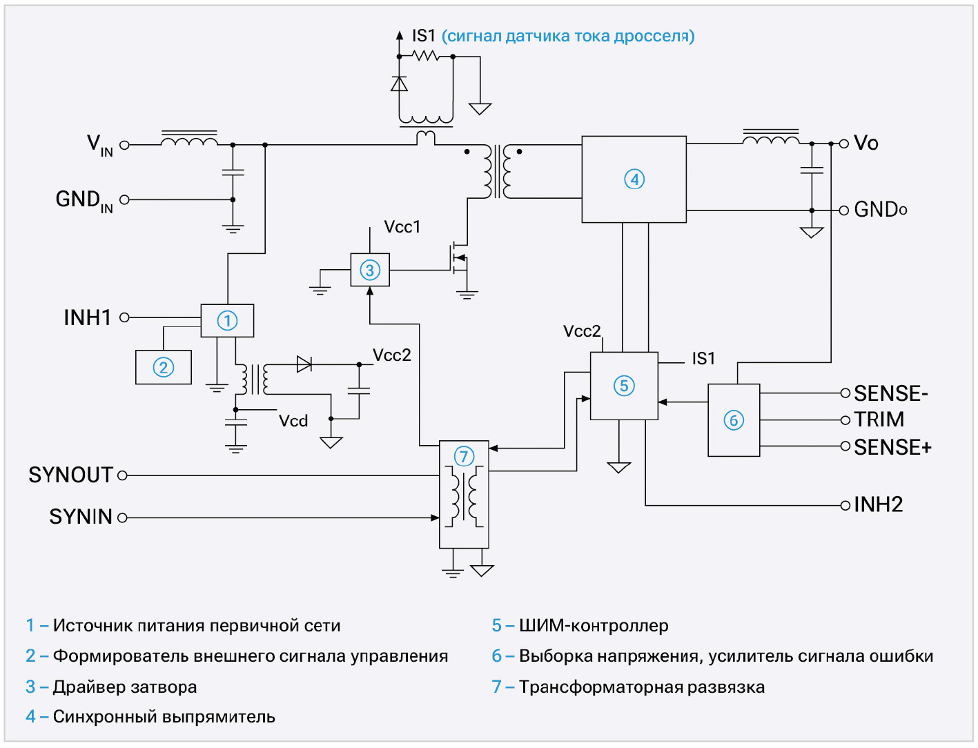 Преобразование осуществляется на частоте 200–400 кГц. Применение схемы синхронного выпрямителя обеспечивает эффективное управление переключающим транзистором цепи регулирования мощности, а небольшие потери синхронного выпрямителя увеличивают КПД. Транзисторы MOSFET синхронного выпрямителя индивидуальным образом оптимизированы для применения в качестве синхронного транзистора в целях максимизации КПД. Размещение ШИМ‑контроллера со встроенным прецизионным источником опорного напряжения на вторичной стороне ближе к нагрузке и ключам синхронного выпрямителя позволяет уменьшить длительность фронтов управляющих напряжений на затворах транзисторов выпрямителя, что способствует увеличению КПД. Импульсы ШИМ для управления силовым ключом передаются на первичную сторону через малогабаритный импульсный трансформатор. Этим достигается максимально возможное быстродействие контура регулирования и упрощается задача обеспечения его устойчивости независимо от уровня входного напряжения и тока нагрузки.