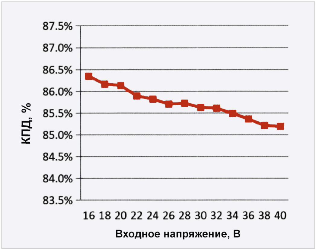 Зависимость КПД от входного напряжения показана на рис. 7 – КПД уменьшается незначительно при максимальном входном напряжении (примерно на 1,3%).