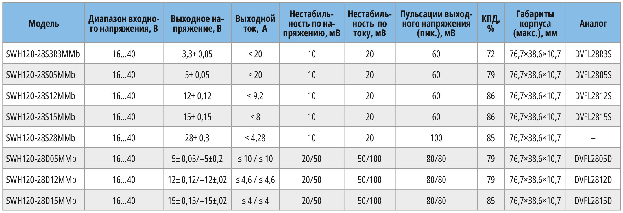 Номенклатура и общие характеристики DC/DC-модулей преобразователей повышенной мощности с выходными мощностями от 66 до 120 Вт, предлагаемые в качестве замены модулям серии DVFL28 (VPT), приведены в табл. 1.