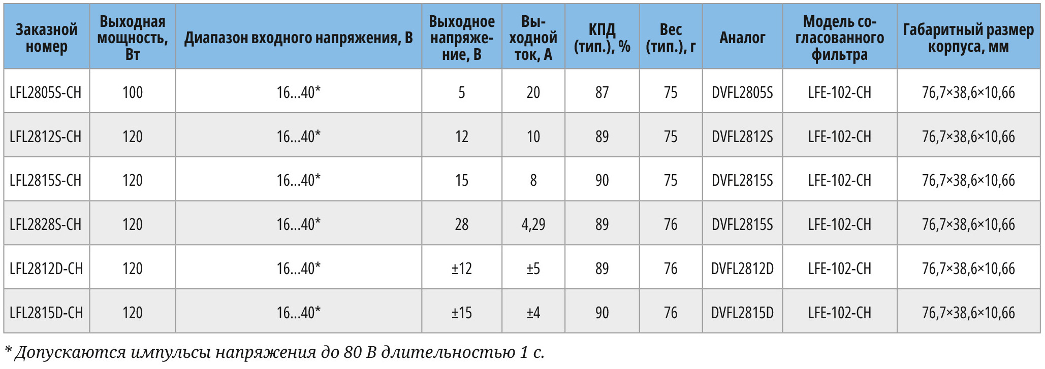 DC/DC-модули электропитания серии LFL с выходными мощностями 100 и 120 Вт для работы в бортовых сетях с диапазоном изменения напряжения от 16 до 40 В (номинальное значение 28 В) являются одной из недавних разработок. Выходные напряжения охватывают наиболее часто востребованные значения 5, 12, 15, 28, ±12, ±15 В. Модули предназначены для эксплуатации при температурах от –55°С до +125°C и стабильно функционируют без изменения технических параметров. Основные технические характеристики DC/DC-преобразователей серии LFL28 приведены в табл. 2.