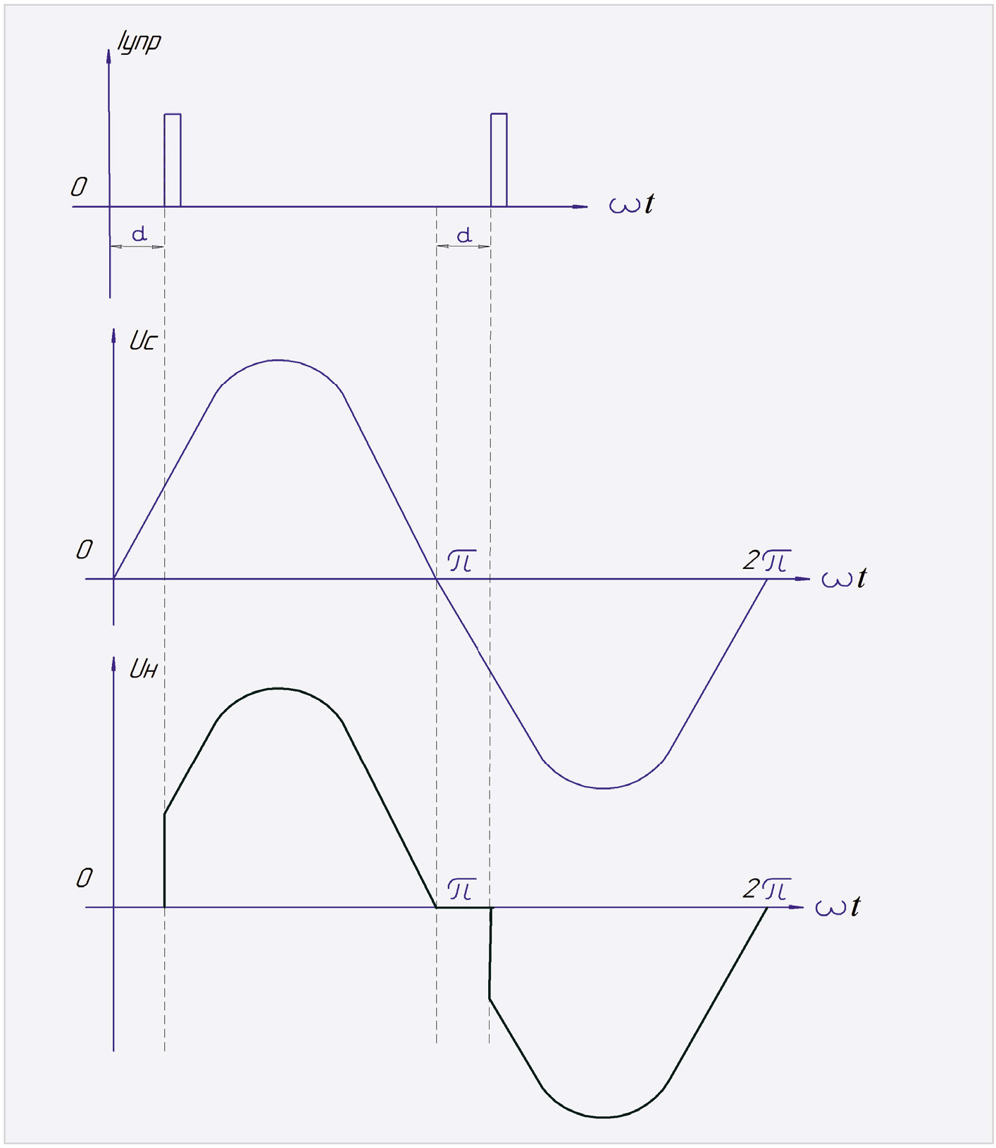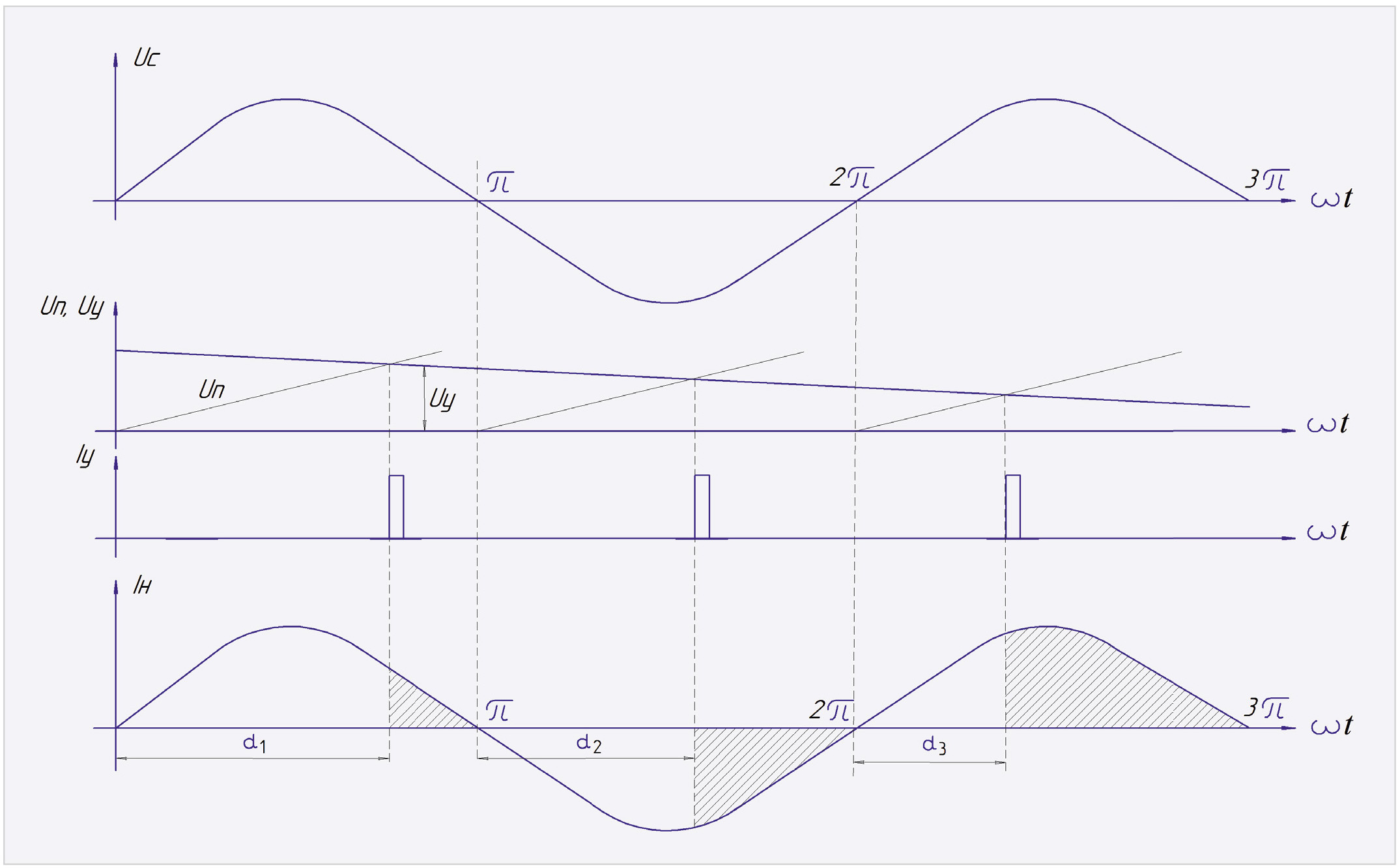 Импульс управления симистором Iу формируется в момент равенства синхронизирующего напряжения пилообразной формы Uп, синфазного с напряжением сети Uc, и управляющего напряжения Uу. При изменении величины Uу, то есть смещении его по вертикали, происходит изменение величины угла управления симистора α (α1 > α2 > α3) и, соответственно, среднего значения тока в нагрузке Iн. Временны́е диаграммы работы ФСУ тангенциального типа представлены на рис. 4.