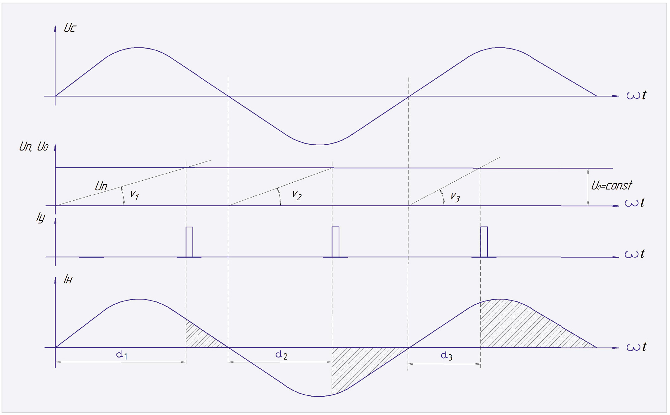 Импульс токам управления Iу формируется в момент сравнения пилообразного напряжения Uп с напряжением постоянного уровня U0 = const. Изменяя угол наклона между Uп и U0 (v1 < v3 < v3), можно регулировать угол включения симистора α (α1 > α2 > α3). Uп при этом должно быть синхронизировано с сетевым напряжением Uc.