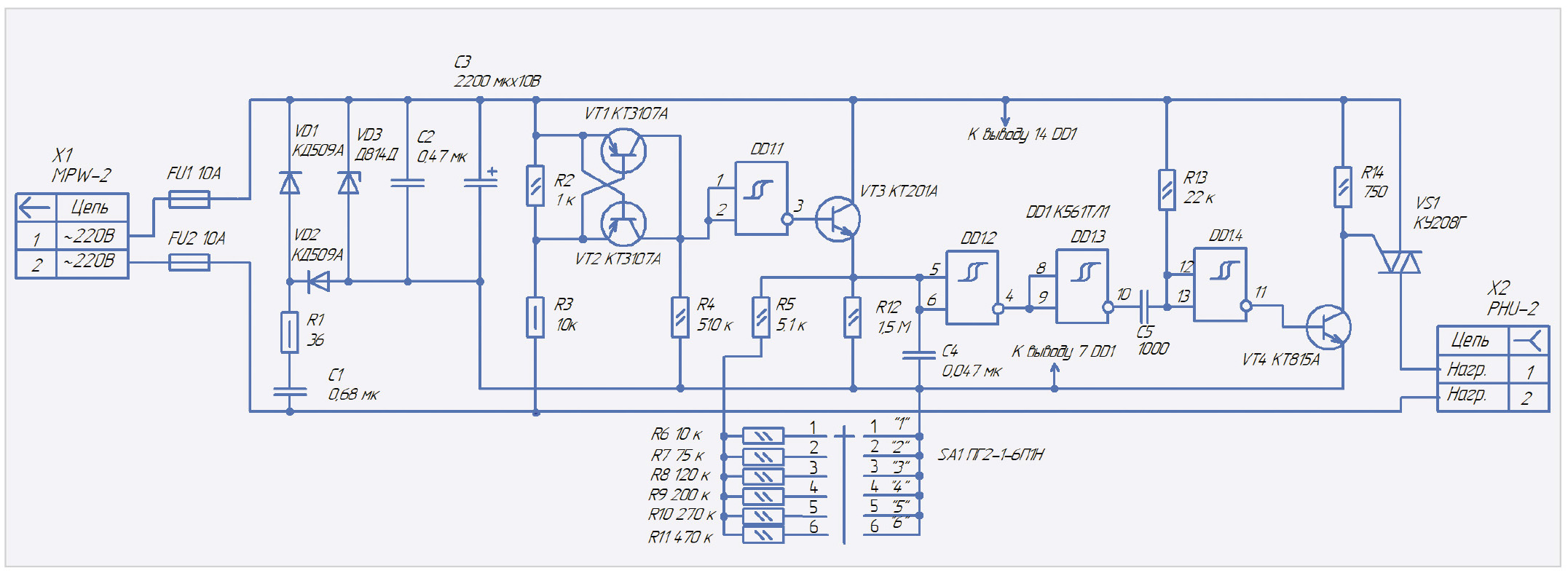 Рассмотрим функциональные узлы устройства, представленного на рис. 5. Источник питания выполнен на следующих элементах: диоды VD1, VD2; стабилитрон VD3; конденсаторы С1…С2; резистор R1. Узел контроля перехода сетевого напряжения через «нуль» выполнен на транзисторах VT1, VT2 и резисторах R2…R4. Транзистор VT1 включён по схеме с общим эмиттером. При положительном полупериоде сетевого напряжения транзистор VT1 открыт и входит в насыщение. Напряжение на его коллекторе близко к эмиттерному. Транзистор VT2 при этом закрыт. При отрицательном полупериоде сетевого напряжения закрыт транзистор VT1. Транзистор VT2, включённый по схеме с общей базой, открыт и насыщен. Напряжение на его коллекторе имеет тот же знак и амплитуду. Когда сетевое напряжение по абсолютному значению меньше, чем 40…50 В, VT1 и VT2 закрыты и напряжение на их коллекторах близко к значению напряжения на выводе 7 микросхемы DD1. Сигнал с выводов коллекторов VT1 и VT2 через инвертирующий элемент микросхемы DD1.1 и через эмиттерный повторитель, выполненный на транзисторе VT3, заряжает конденсатор С4 до уровня напряжения источника питания. Если переключатель SA1 установлен в положение «1», то конденсатор С4 разряжается через резисторы R5, R6, R12. При снижении напряжения на нём до определённого порогового значения элементы DD1.2 и DD1.3 переключаются. Спад импульса с выхода элемента DD1.3 дифференцируется цепью С5 R13 в виде импульса длительностью порядка 12 мкс. Данный импульс через инвертор DD1.4 и транзистор VT4 включает симиcтор VS1. Переключателем SA1 можно регулировать длительность разрядки конденсатора С4. То есть изменять момент включения симистора VS1 и эффективное напряжение на нагрузке. Принципиальна схема фазового регулятора с применением динистора в цепи управления симистора приведена на рис. 6.
