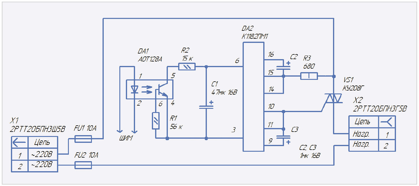 Микросхема может применяться для регулировки мощности в нагрузке до 150 Вт. Для управления более мощной нагрузкой в принципиальную схему регулятора необходимо ввести мощный симистор. На рис. 8 приведена принципиальная схема фазового регулятора на базе микросхемы К1182ПМ1 и симистора КУ208Г.