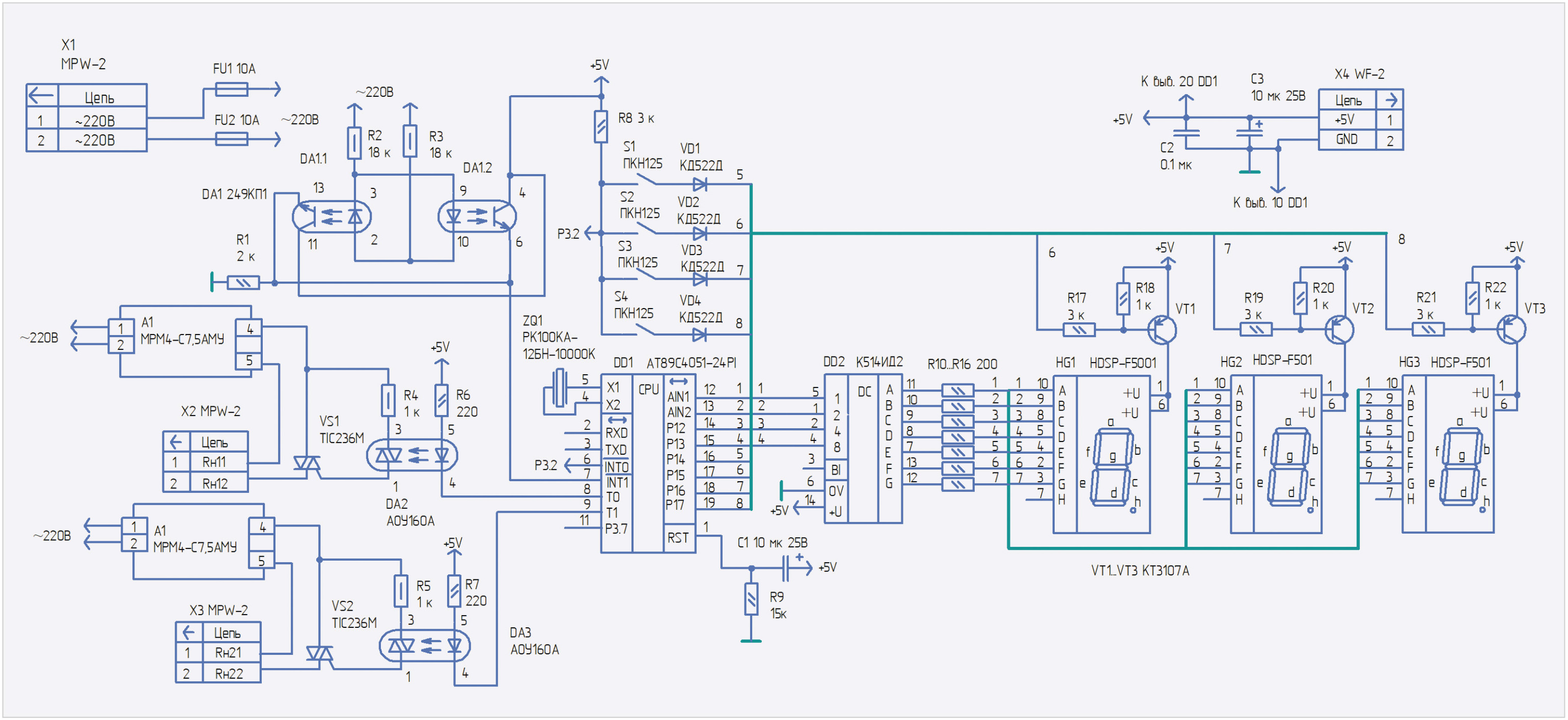 Индикатор HG1 – HDSP-F001 красного цвета, индикаторы HG2, HG3 – HDSP-F501 зелёного цвета. Элементы R9 и С1 при подаче напряжения питания +5V осуществляют системный аппаратный сброс микроконтроллера DD1. Ток через каждый канал регулирования мощности ограничен предельно допустимым током 7,5А через сетевые фильтры МРМ4-С7,5АМУ. При небольших нагрузках, а также если требования по уровню помех не очень высокие, сетевые фильтры можно исключить из схемы. Нагрузки подключаются к устройству через соединители (вилки) Х2, Х5 типа МРW-2 (ответная часть – розетки MHU-2). Сетевое напряжение поступает на устройство через соединитель Х1 типа МРW-2. Питающее напряжение +5 В поступает на плату устройства через соединитель Х4 типа WF-2 (ответная часть розетка HU-2).