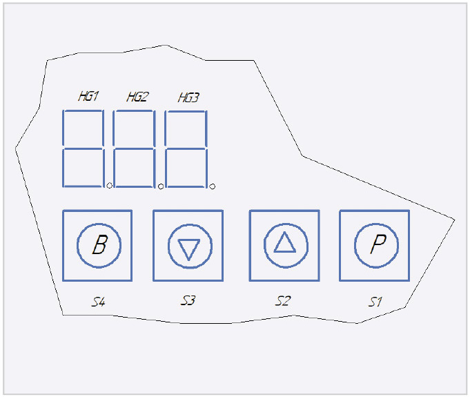 Регулирование мощности осуществляется фазоимпульсным управлением данных симисторов. Диапазон регулирования выходной мощности каждого канала задаётся в относительных единицах от 0 до 99. В интерфейс управления (рис. 13) входят клавиатура (кнопки S1…S4) и блок индикации из трёх цифровых семисегментных индикаторов HG1…HG3.