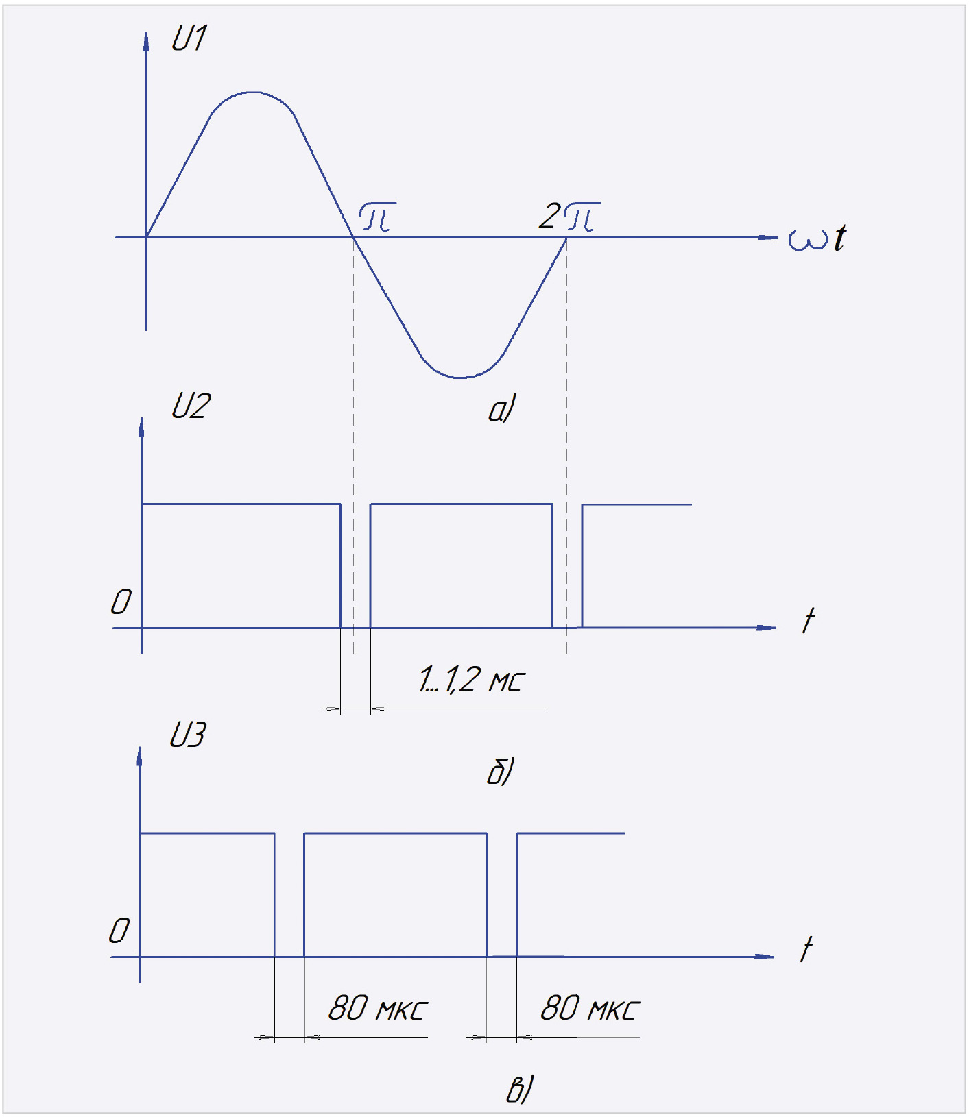 В каждом полупериоде сетевого напряжения (рис. 14а) микроконтроллер запускающим импульсом с вывода 8 длительностью 80 мкс (рис. 14в) включает симистор VS1 через оптрон DA1. Значение мощности в нагрузке, подключённой к соединителю Х2, зависит от того, как долго симистор будет включён в течение каждого полупериода сетевого напряжения. Для того чтобы значение подключаемой мощности в нагрузке возрастало с увеличением значения задаваемой мощности на индикаторе устройства, а также для получения дискретности регулирования 1% необходимо, чтобы импульс включения симистора смещался с шагом 100 мкс с момента прохождения сетевого напряжения через нуль, справа налево по рис. 14в, при увеличении на единицу значения задаваемой мощности на индикаторе устройства.