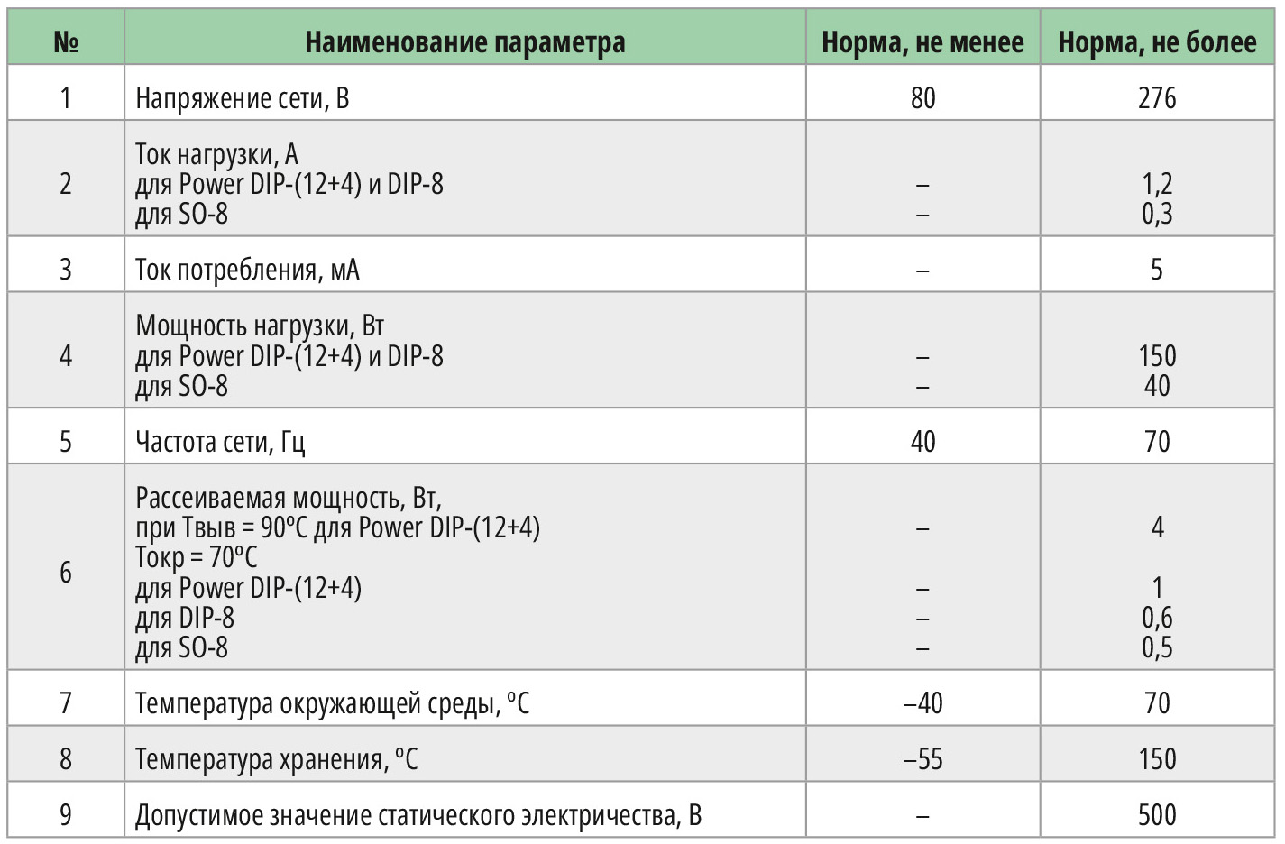 В настоящее время на рынке данная микросхема представлена в следующих корпусах: Power DIP-(12+4), DIP-8 и SO-8. Данная микросхема широко применяется для плавного включения и выключения ламп накаливания или регулировки их свечения, а также для регулировки скорости вращения электродвигателей (мощностью до 150 Вт) и управления силовыми элементами (тиристорами и симисторами). Количество подключаемых внешних элементов, необходимых для функционирования микросхемы в составе фазового регулятора, сравнительно небольшое. Предельно допустимые значения электрических параметров для К1182ПМ приведены в табл. 1.