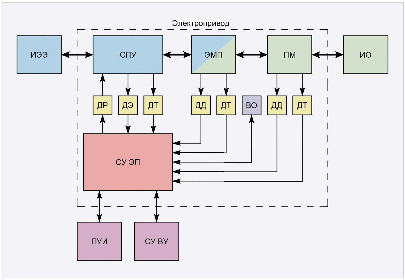 Таким образом, ЭП осуществляет энергетическое взаимодействие с источником электрической энергии и рабочей машиной, информационное взаимодействие с СУ ВУ, а также имеет возможность взаимодействовать с человеком-оператором через ПУИ, когда требуется вручную изменить какие-либо параметры ЭП или наблюдать за его состоянием.
