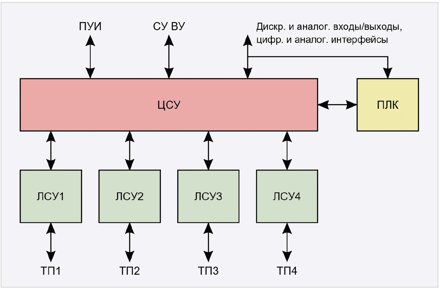 - ЦСУ – центральная (главная) СУ, которая управляет ЛСУ и координирует их работу, осуществляет информационное взаимодействие с ПУИ, СУ ВУ и другими внешними устройствами, а также общее управление ЭП;