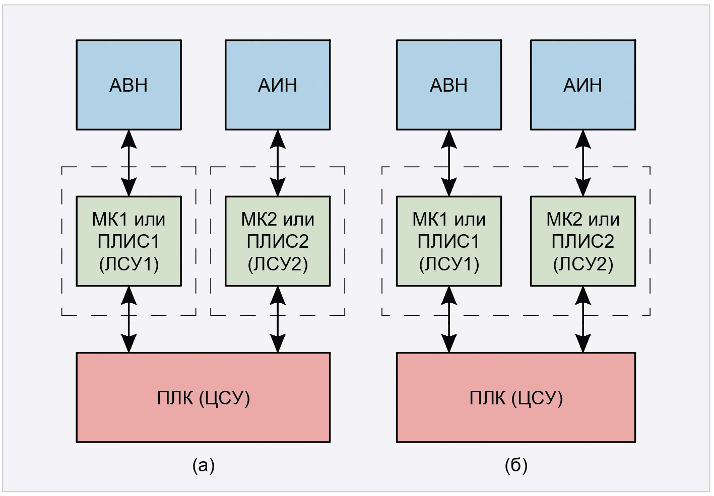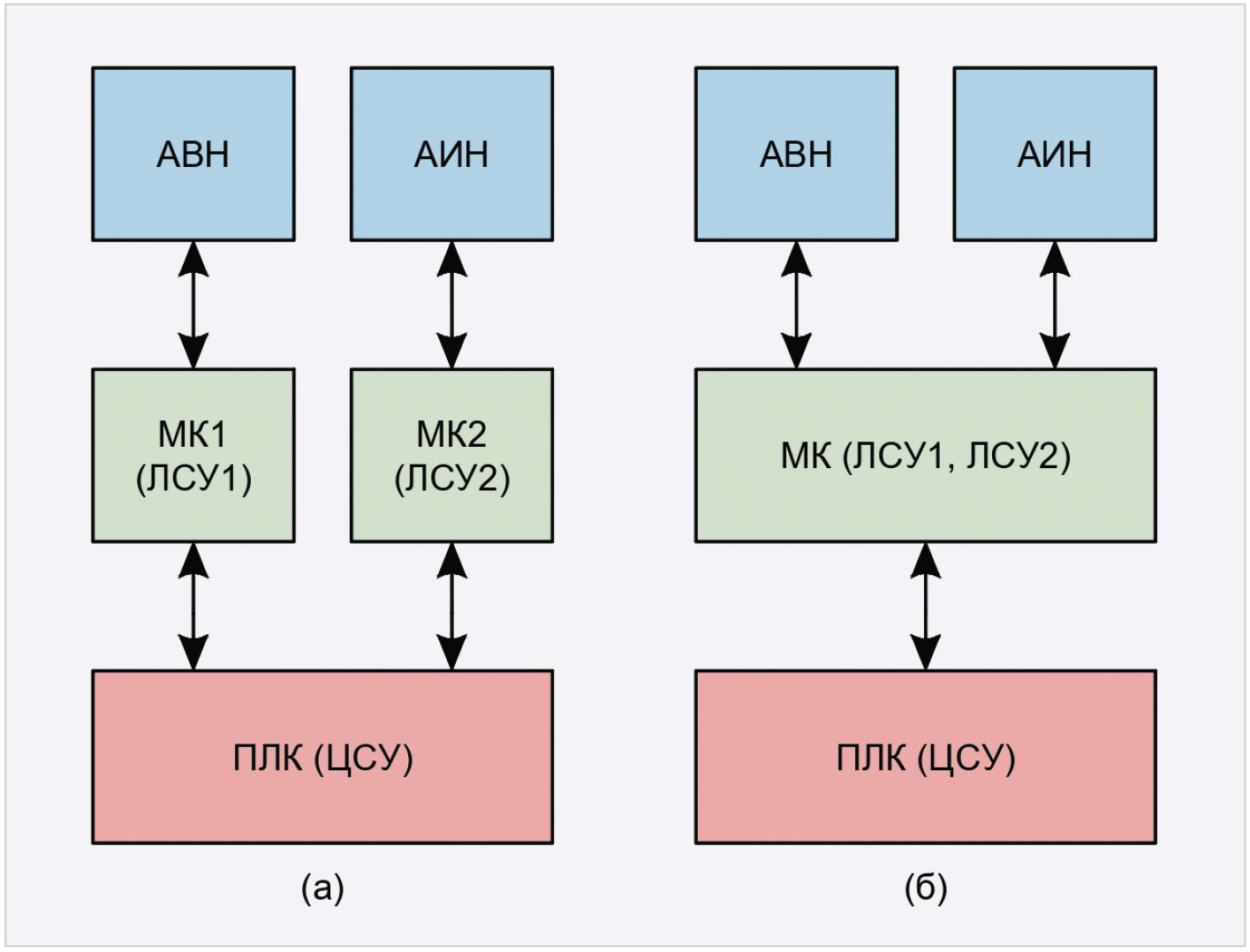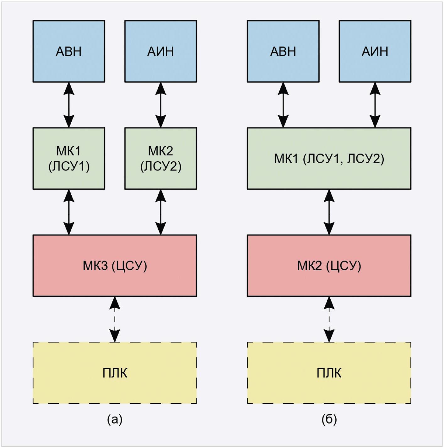 - ЛСУ реализованы на базе одного или двух МК, а ЦСУ построено на базе ПЛК: МК1 управляет АВН, МК2 – АИН, а ПЛК выполняет функции ЦСУ (рис. 6а), или МК управляет АВН и АИН, а ПЛК выполняет функции ЦСУ (рис. 6б);