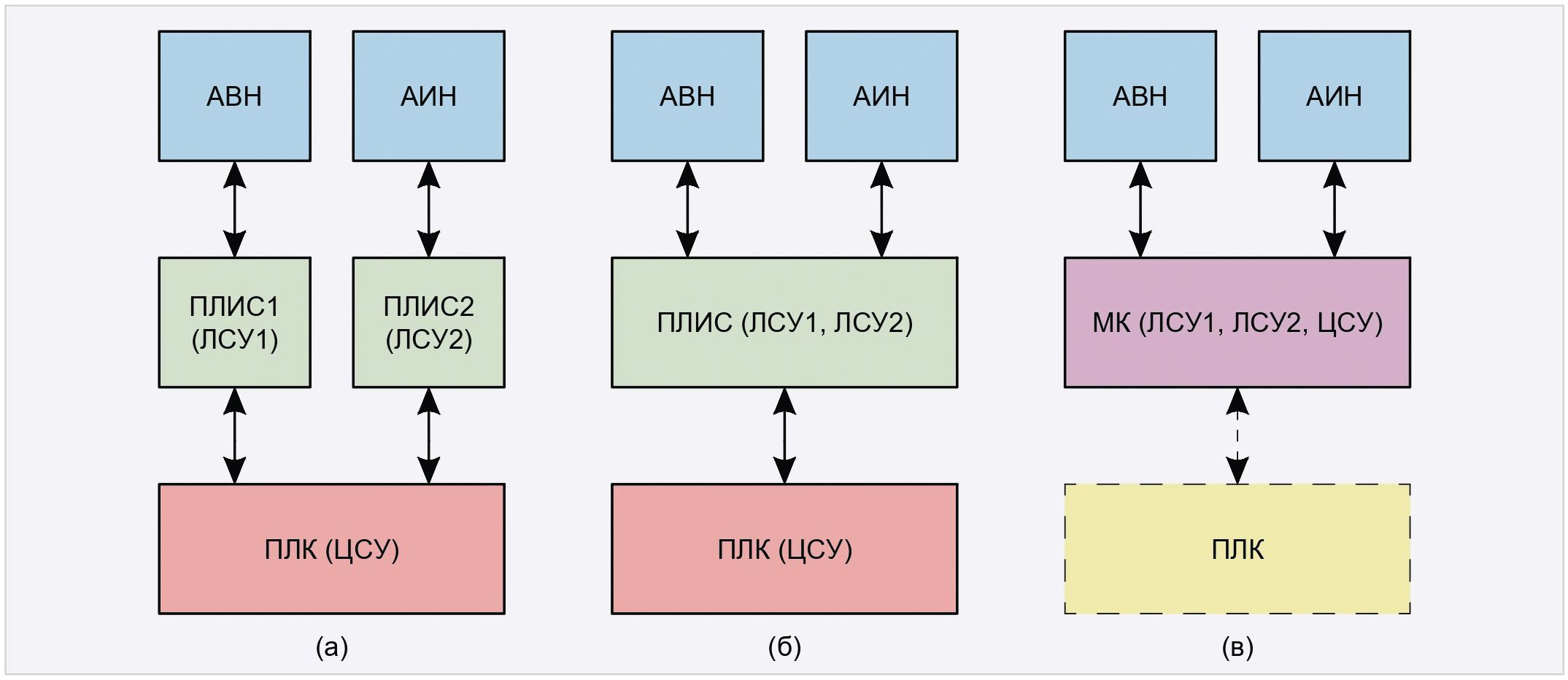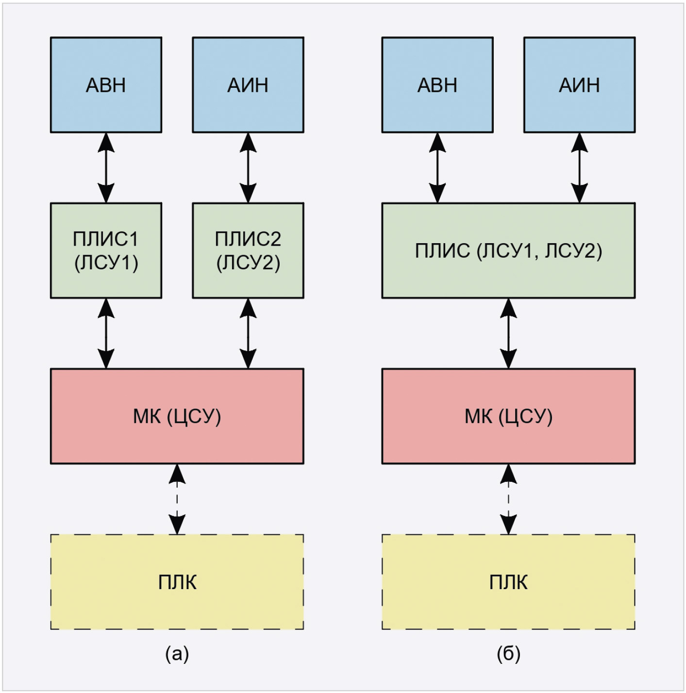 - ЛСУ реализованы на базе одной или двух ПЛИС (СИС), а ЦСУ построено на базе ПЛК: ПЛИС1 управляет АВН, ПЛИС2 – АИН, а ПЛК выполняет функции ЦСУ (рис. 7а), или ПЛИС управляет АВН и АИН, а ПЛК выполняет функции ЦСУ (рис. 7б);
