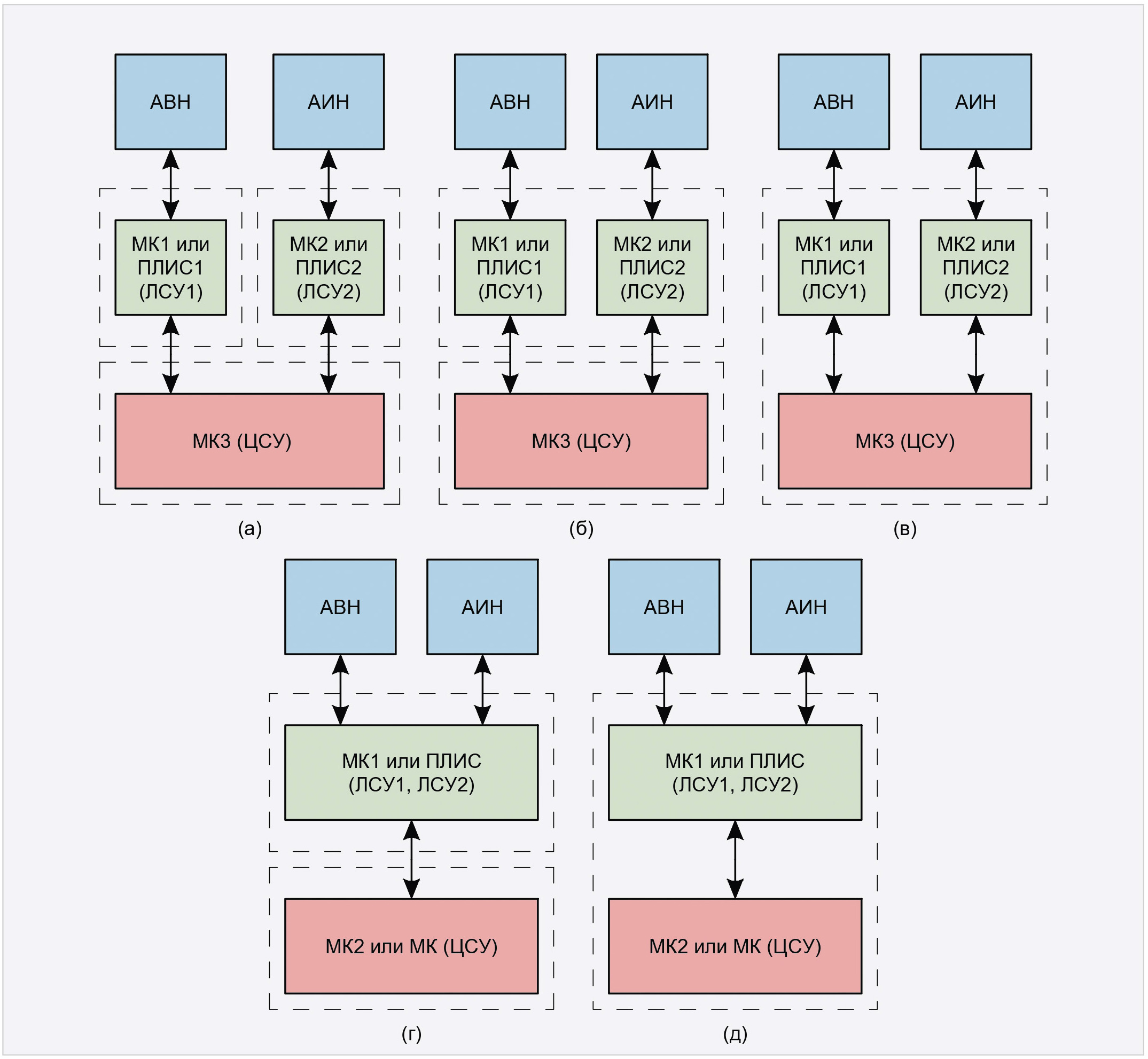 - ЛСУ и ЦСУ реализованы на базе одного МК, который управляет АВН, АИН и выполняет функции ЦСУ (рис. 7в).
