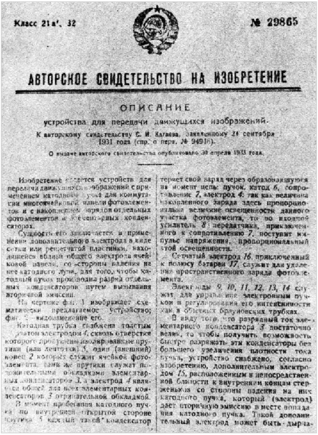Действительно, патентная заявка от 24 сентября 1931 года С.И. Катаева (рис. 1), в которой шла речь об «устройстве для передачи движущихся изображений», на 51 день опередила аналогичную заявку Зворыкина. Это первенство легко проверить [2].
