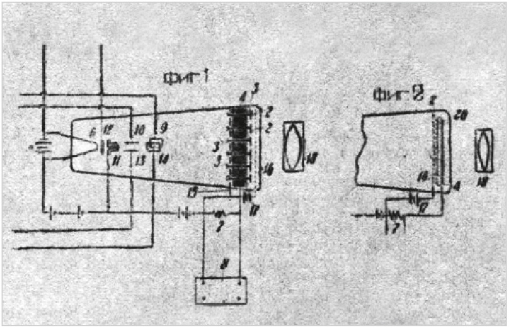 На рис. 4 представлена схема «радиоглаза» – передающей телевизионной трубки С.И. Катаева, сканированная из его патента. На схеме слева цифрами обозначены: