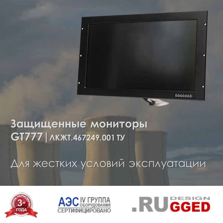 Мониторы проектировались для обеспечения соответствия требованиям стандартов, принятых в атомной отрасли, а также условиям промышленной эксплуатации в целом. Изделия GT777-24/27” (ЛКЖТ.467249.001-00 ТУ) соответствуют категории I по НП-031; выдерживают до 9 баллов по шкале MSK-64; отвечают требованиям IV группы исполнения ТС АС-ЯРО по устойчивости к помехам, ГОСТ 32137; соответствуют требованиям, предъявляемым к устройствам класса безопасности 2, согласно НП-001; имеют высокие эксплуатационные параметры в части электромагнитной совместимости. Вся нормативная база GT777-24/27” подтверждена сертификационными лабораторными испытаниями и эксплуатацией. Несмотря на ориентацию GT777-24/27” в части отраслевой нормативной базы преимущественно на атомную промышленность, мониторы данной серии прекрасно подойдут для специальных приложений. Испытательная база GT777-24|27” на стойкость к ВВФ позволяет судить о соответствии изделия требованиям к ряду групп наземного и морского базирования согласно ГОСТ РВ 20.39.304.