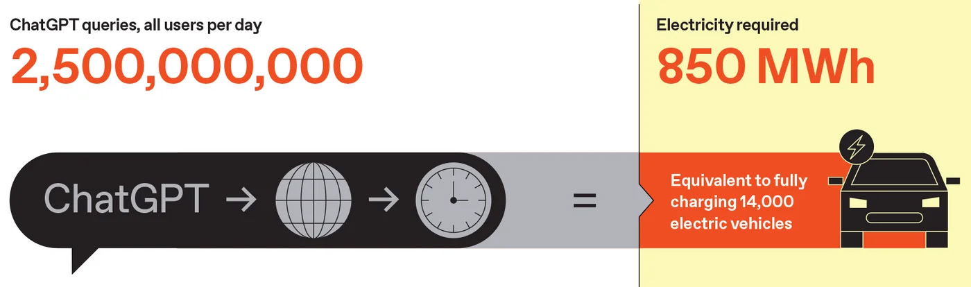 - 0,34 Вт·ч на один запрос (по словам Сэма Альтмана) → 850 МВт·ч ежедневно. Этого хватит, чтобы зарядить тысячи электромобилей в день.