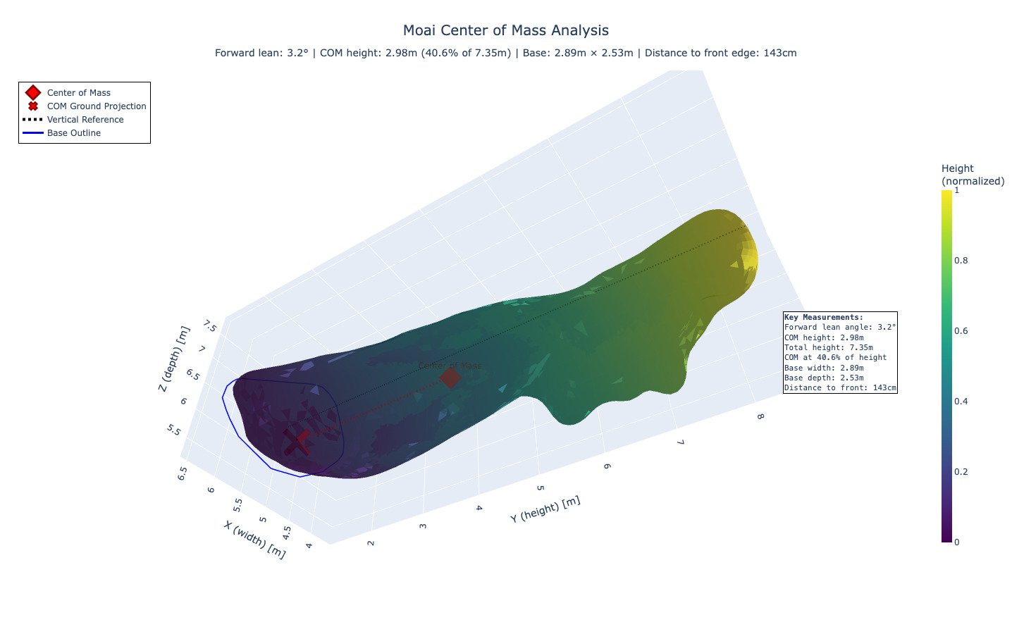 3D-моделирование показало, что у большинства моаи есть широкое D-образное основание и незначительный наклон вперёд, что делало их устойчивыми при «шагающем» движении.