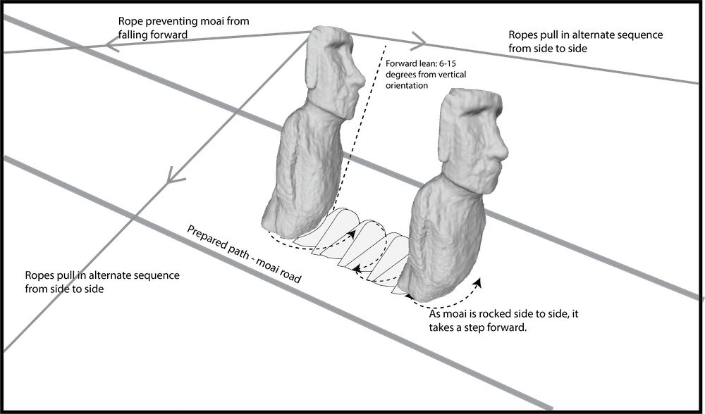Антропологи Карл Липо и Терри Хант проанализировали 962 статуи моаи, создав их высокоточные 3D-модели, чтобы изучить конструкцию и возможные способы перемещения. На основе полученных данных исследователи провели серию экспериментов, воспроизводящих движение статуй по острову.
