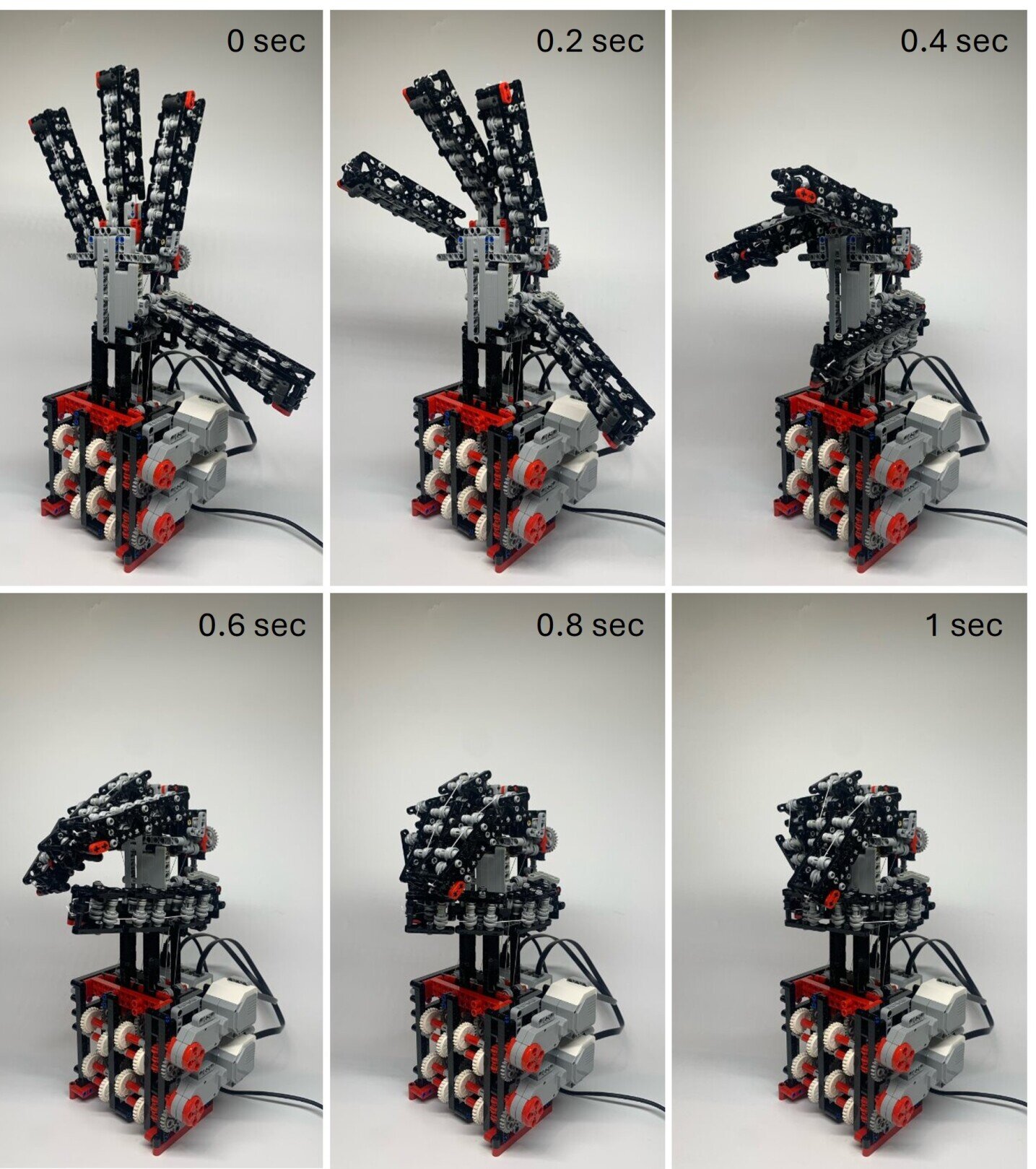Рука, оснащённая четырьмя пальцами (включая противоположный большой) и двенадцатью суставами, приводится в движение всего двумя моторами. Специальная система «сухожилий» — обычные шнуры — имитирует работу мышц, а уникальный дифференциал из шестерён LEGO позволяет пальцам автоматически подстраиваться под форму объекта. Благодаря механизму «мягкой синергии», если один палец упирается в препятствие, мощность перераспределяется на остальные, обеспечивая надёжный и естественный хват.