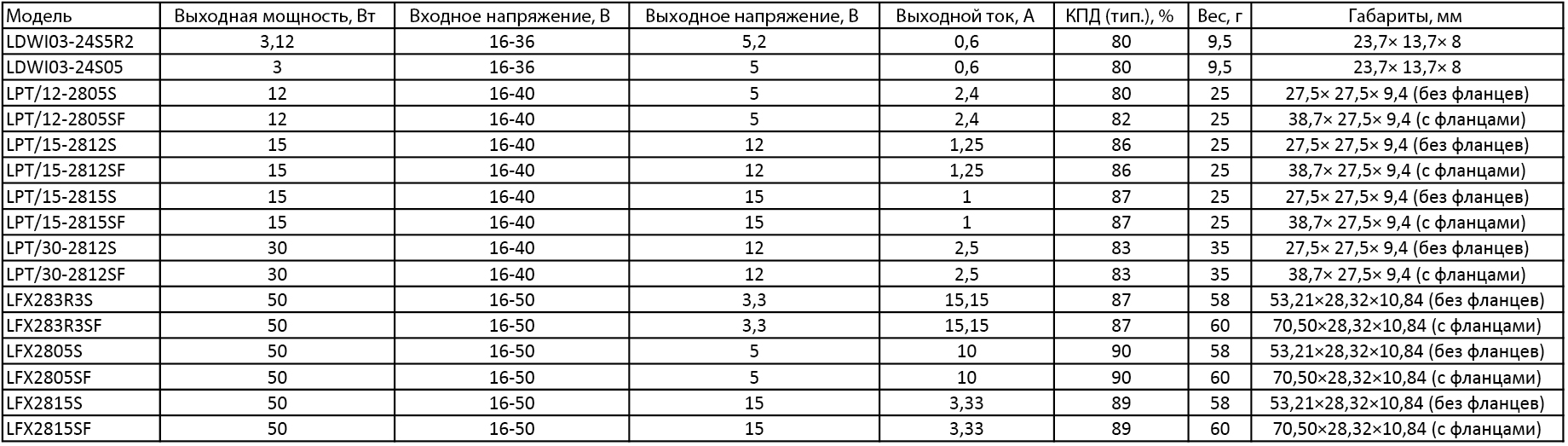 - входное напряжение: 16–36 В, 16–40 В, 16–50 В; номинальное значение — 28 В;