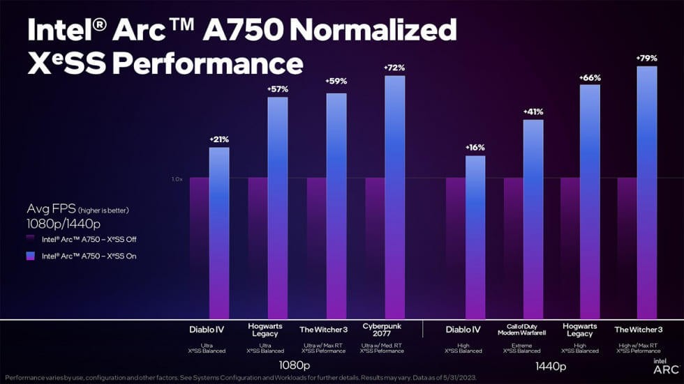 XeSS построена на открытом наборе инструкций DP4a, совместима не только с графическими процессорами Intel, но и с видеокартами NVIDIA и AMD. Однако наилучшая производительность достигается на вычислителях Intel® Arc™, где в полной мере имеется возможность использовать выделенное ускорение ИИ через движок XMX.
