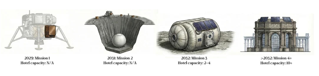 - Третья миссия (2032): ввод в эксплуатацию первой версии отеля Moon — достаточно большой, чтобы разместить до четырёх гостей одновременно.