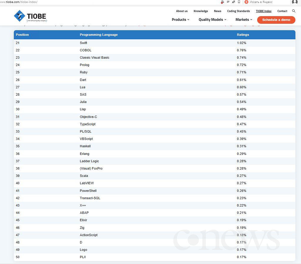 Отдельного внимания заслуживает рост специализированных языков. Язык R поднялся с 15-го на 8-е место с долей 2,19%, что свидетельствует о возрождении интереса к статистическому анализу и научным вычислениям вне экосистемы Python. Perl совершил ещё более резкий скачок — с 30-го на 11-е место (1,67%), что может быть связано с возрождением в нишевых скриптовых задачах и legacy-системах.