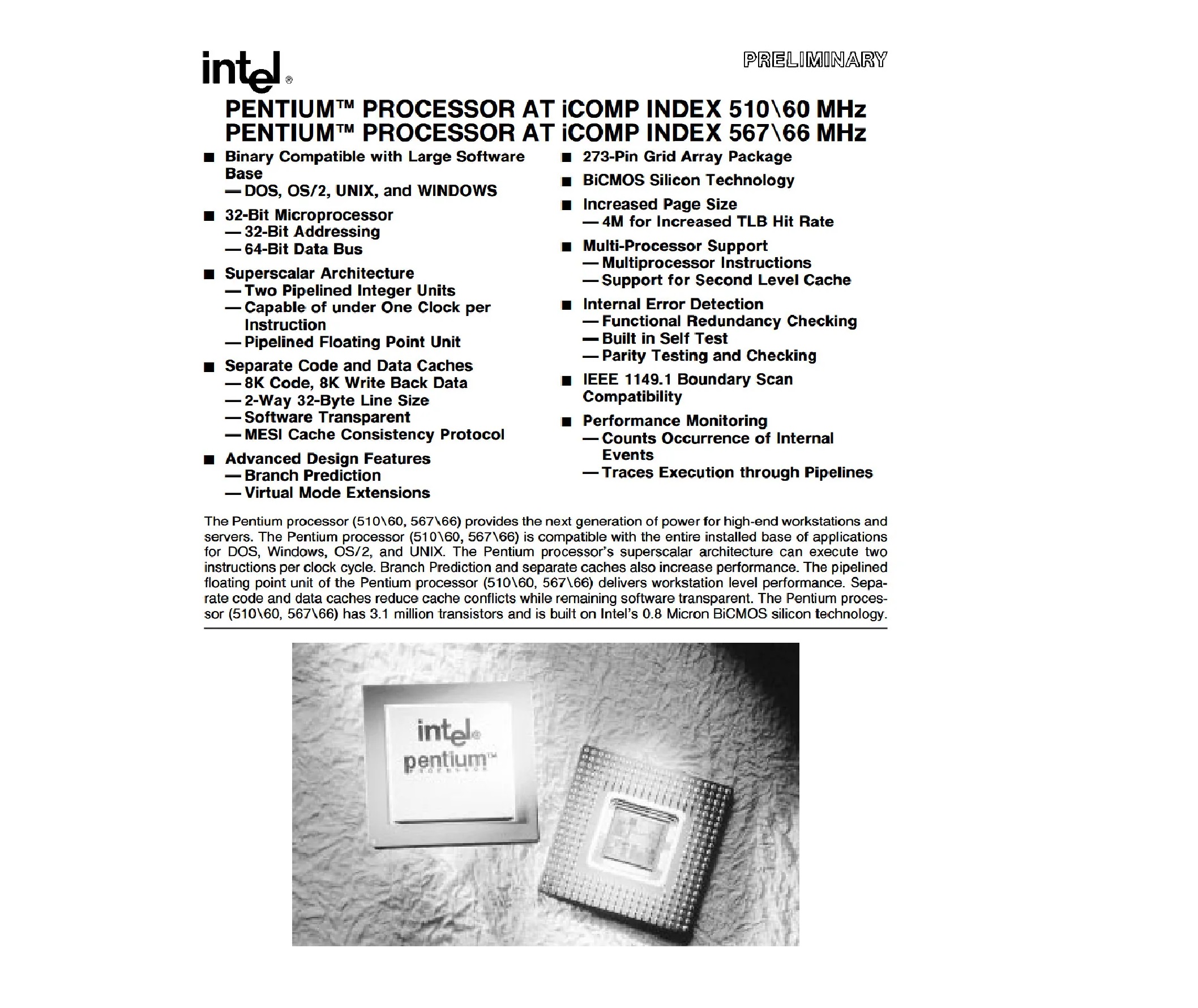 Первые модели — Pentium 60 и Pentium 66 — выпускались по 800-нм техпроцессу и содержали около 3,1 млн транзисторов. В архитектуру были заложены решения, которые позже стали стандартом отрасли: